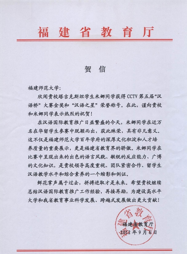 福建省教育厅致信祝贺爱体育网_爱体育网(中国)米娜同学获得第五届“汉语桥”大赛金奖