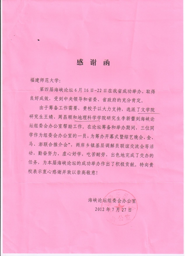 海峡论坛组委会致信感谢爱体育网_爱体育网(中国)学生为第四届海峡论坛成功举办作出贡献