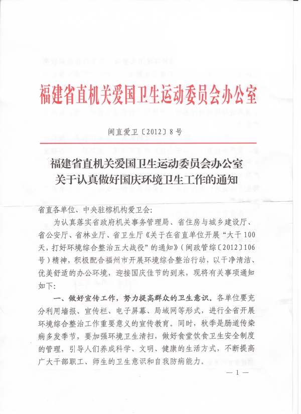 现将《福建省直机关爱国卫生运动委员会办公室关于做好国庆环境卫生工作的通知》(闽直爱卫[2012]8号)转发给你们,请按照通知要求做好国庆环境卫生工作。宣传部和校医院牵头做好秋季卫生常识的宣传教育工作。相关单位要做好办公楼、办公室、教学楼、实验室、宿舍楼及包干区卫生工作;结合秋季特点做好食堂卫生、食品安全工作;做好校园环境整治和除“四害”等工作。