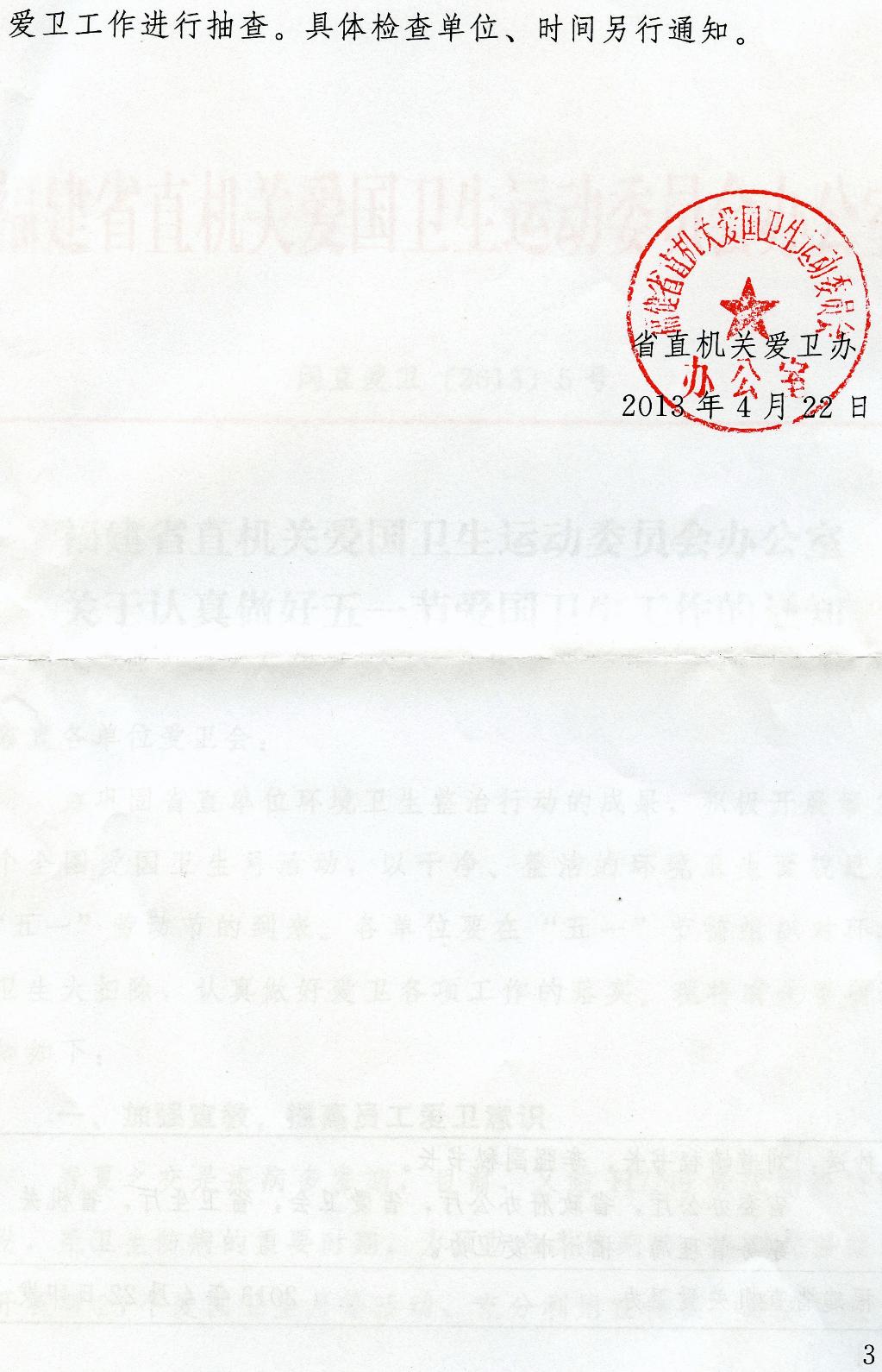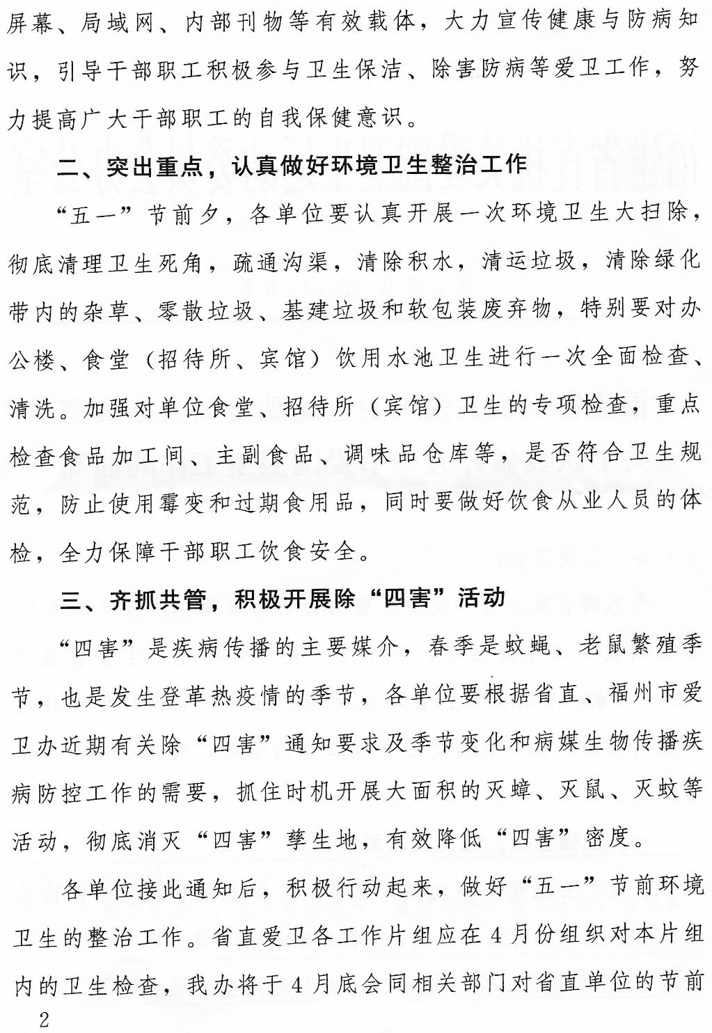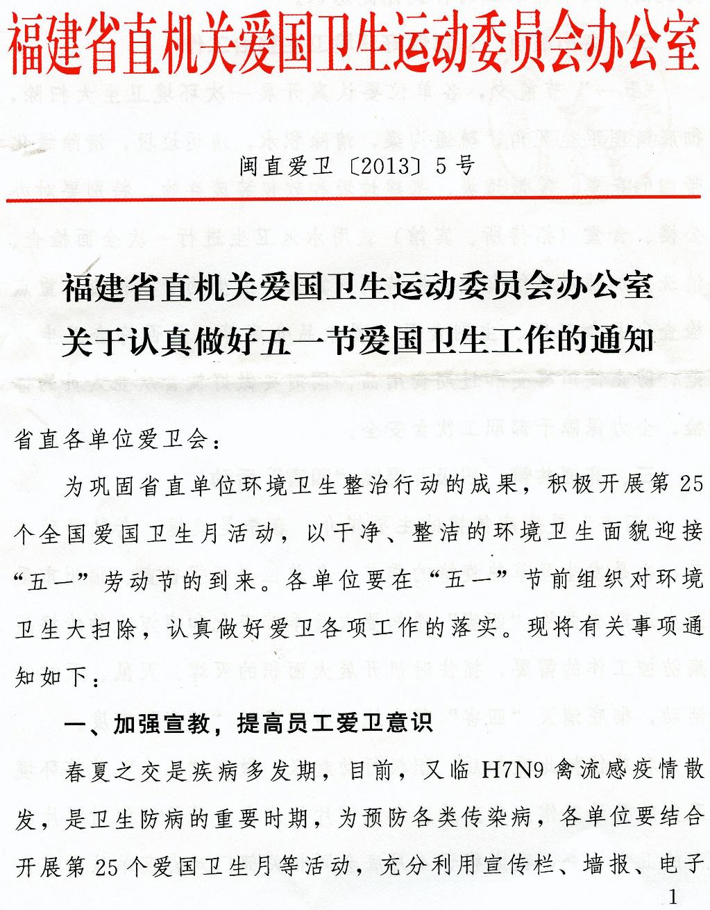 现将《福建省直机关爱国卫生运动委员会办公室关于认真做好五一节爱国卫生工作的通知》(闽直爱卫[2013]5号)转发给你们,请按照通知要求认真做好五一节爱国卫生工作。宣传部和校医院牵头做好春季卫生常识的宣传教育工作。相关单位要做好办公楼、教学楼、实验室、宿舍楼及包干区卫生工作;结合春季特点做好食堂卫生、食品安全工作;做好校园环境整治和除“四害”等工作。