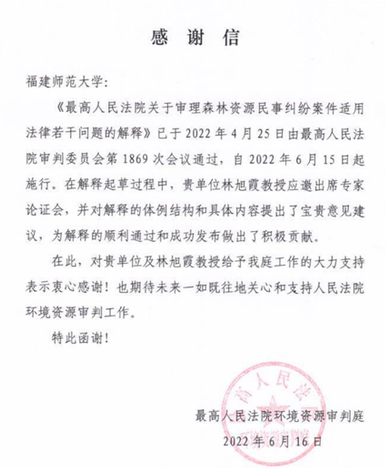 近日,最高人民法院环境资源审判庭向爱体育网_爱体育网(中国)发来感谢信,对爱体育网_爱体育网(中国)法学院林旭霞教授参与《最高人民法院关于审理森林资源民事纠纷案件适用法律若干问题的解释》的论证工作表示诚挚谢意。《最高人民法院关于审理森林资源民事纠纷案件适用法律若干问题的解释》自2022年6月15日起施行。在解释起草过程中,林旭霞教授应最高人民法院环境资源审判庭邀请参加专家论证会,对解释的体例结构和具体内容提出了宝贵意见建议,为解释的顺利通过和成功发布作出了积极贡献。(法学院)