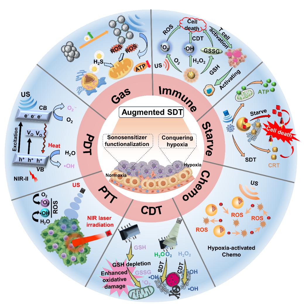 近日,爱体育网_爱体育网(中国)海峡柔性电子(未来科技)学院(研究院)杨震教授课题组针对目前报道的利用纳米医学技术增强肿瘤声动力治疗策略进行了详细地分析与总结,提出了三种用于增强声动力治疗的前沿展望,包括声敏剂优化,缓解缺氧肿瘤微环境及基于声动力治疗的联合治疗策略。系统地总结了声动力治疗与其他治疗方式联合治疗的协同作用,包括与化学动力学疗法、光动力疗法、光热疗法、化疗、饥饿疗法、气体疗法和免疫疗法的结合。在此基础上讨论了当前基于声动力治疗的肿瘤治疗过程中所面临的挑战,并提供了增强治疗效果的可行方法,从而促进了增强声动力治疗在临床转化中的巨大应用前景。该工作以“Engineering Sonosensitizer-Derived Nanotheranostics for Augmented Sonodynamic Therapy”为题发表在国际期刊《Small》上。