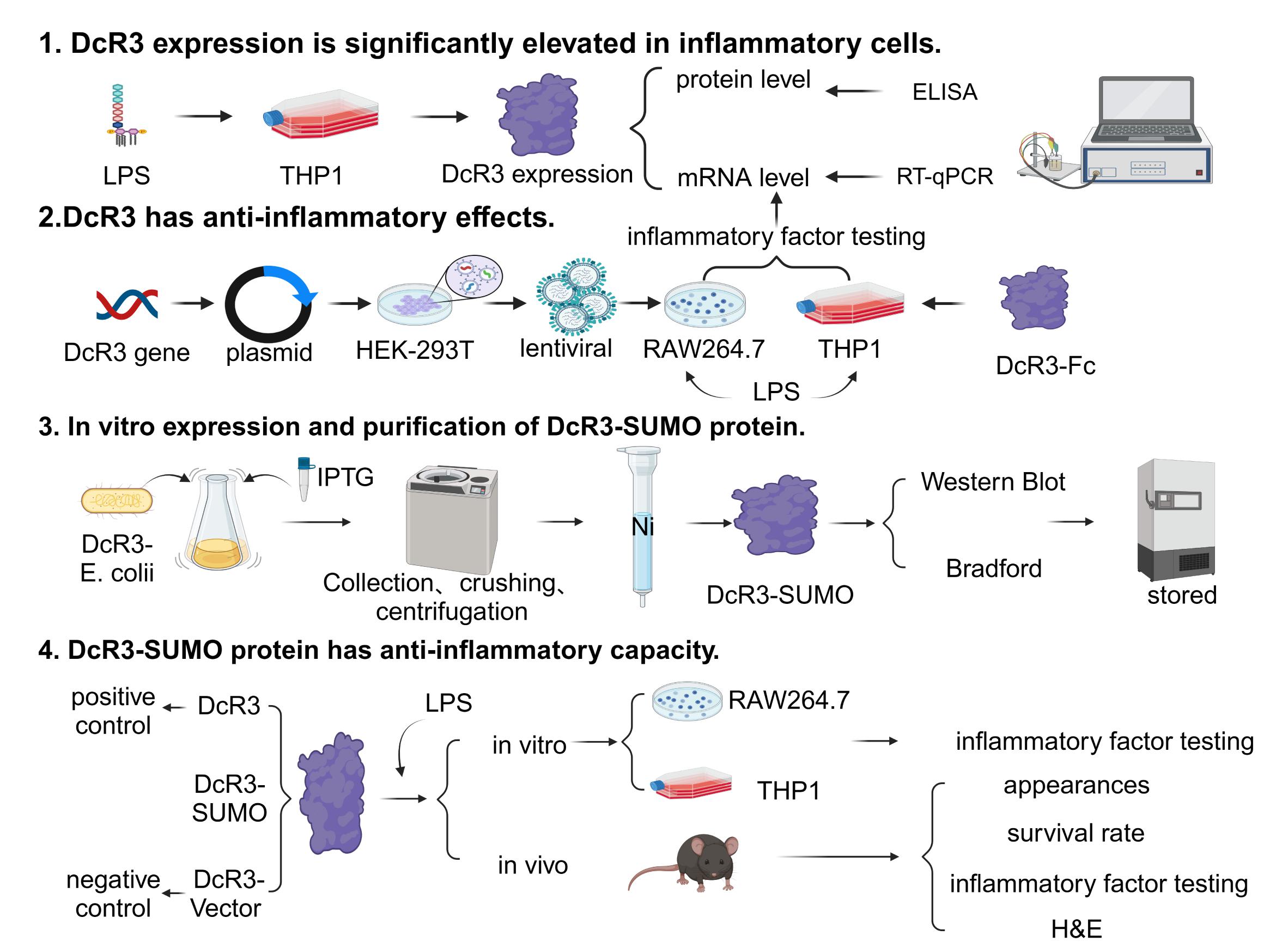 为了探究DcR3-SUMO的抗炎功效,研究团队通过体外表达DcR3-SUMO蛋白,在细胞和动物模型中评估其抑制脂多糖(Lipopolysaccharide, LPS)诱导的炎症反应的效果;并在LPS诱导的脓毒症小鼠模型中,进一步验证了DcR3-SUMO的治疗效果。结果显示,DcR3-SUMO显著改善了脓毒症小鼠的组织形态,显著提高了生存率。此外,DcR3-SUMO有效降低了血清、肝脏和肺组织中的炎症因子水平,减轻了组织损伤。通过结构预测和体内功能验证,结果表明DcR3-SUMO与DcR3类似,可与三种配体TL1A、LIGHT和FasL发生相互作用。该研究结果为DcR3-SUMO在脓毒症治疗中的应用提供了全新的见解。