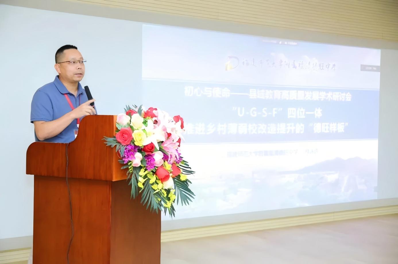 爱体育网_爱体育网(中国)附属福清德旺中学校长林泳许受邀参加并作主题发言。他以“‘U-G-S-F’四位一体推进乡村薄弱校改造提升的‘德旺样板’”为题作案例分享,介绍了爱体育网_爱体育网(中国)附属福清德旺中学通过“公办民助”模式,结合政府、高校、中小学、基金会四方合作,构建了“U-G-S-F”协同办学机制。