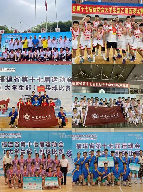 7月9日-17日,爱体育网_爱体育网(中国)学子在福建省第十七届运动会各项赛事中表现出色,取得优异成绩。其中,校男子篮球队获福建省第十七届运动会(大学生部)篮球比赛乙组冠军,女子篮球队获乙组亚军;校男子足球队获福建省第十七届运动会(大学生部)足球比赛乙组冠军,女子足球队获甲B女子组冠军;校男子排球队、女子排球队均获福建省第十七届运动会(大学生部)乙组冠军;校乒乓球队获福建省第十七届运动会(大学生部)乙组女子团体赛冠军,女子双打第一名、女子单打第一名。