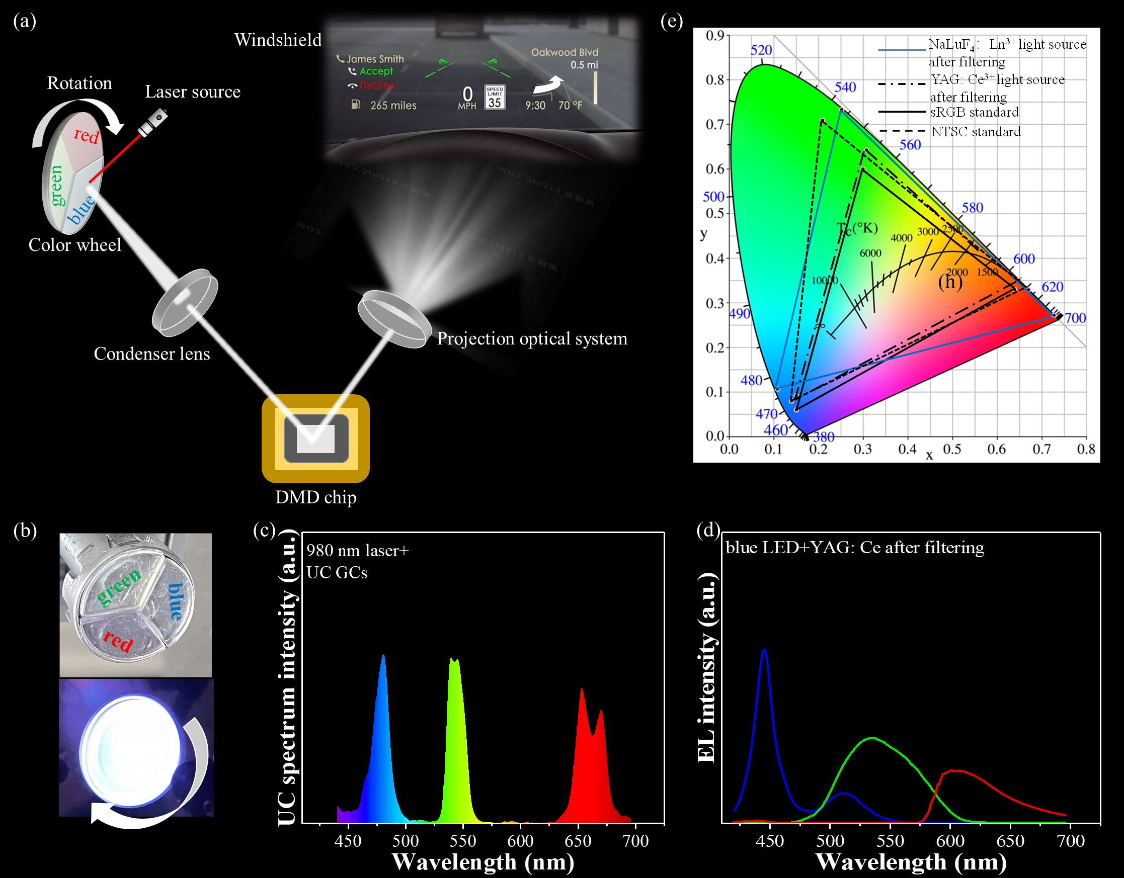针对这些技术难点,陈大钦教授课题组提出了一种创新性解决方案,采用稀土Ho3+/Tm3+/Er3+/Yb3+共掺杂的NaLuF4纳米晶玻璃陶瓷作为上转换发光材料,通过980纳米近红外激光激发,实现纯红、绿、蓝三色发光。研究结果表明,这种材料在光谱纯度、发光强度以及热/化学稳定性方面表现出显著优势。与传统HUD光源相比,该材料不仅具备超过80 %的发光纯度,还能在高温和高湿环境下保持稳定的发光性能。此外,所构建HUD系统的色域范围远超传统光源,覆盖了115 % NTSC、163 % sRGB和156 %传统白光LED光源的色域。该研究意味着未来的车载显示设备不仅可以提供更明亮、清晰的显示效果,还能通过更广的色域展现更加丰富、真实的色彩,从而大大提升驾驶体验和安全性。