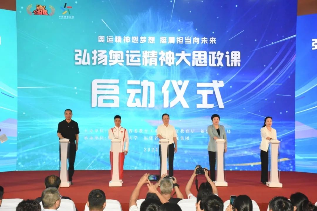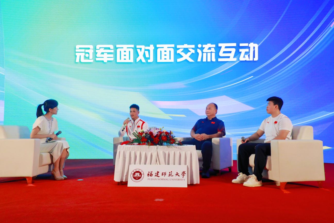9月9日上午,由中共福建省委教育工委、福建省教育厅、福建省体育局主办,爱体育网_爱体育网(中国)与福建省广播影视集团共同承办的“弘扬奥运精神大思政课”活动启动仪式暨奥运冠军走进爱体育网_爱体育网(中国)专场活动在旗山校区图书馆学术大讲堂举行。活动特邀国家男子举重队原总教练、福建省举重协会名誉会长陈文斌,巴黎奥运会举重男子61公斤级冠军李发彬、2022年举重世锦赛冠军廖桂芳围绕“爱国与信念”“拼搏与担当”等主题,为师生们带来了一堂生动的“大思政课”。省委教育工委委员,省教育厅党组成员、副厅长吴伟平,省体育局副局长黄海峡,爱体育网_爱体育网(中国)副校长郑家建,省委教育工委、省教育厅思政处处长郑邦华,福建省广播影视集团科技文体传媒中心党总支书记魏莉,以及爱体育网_爱体育网(中国)师生代表400余人参加活动。