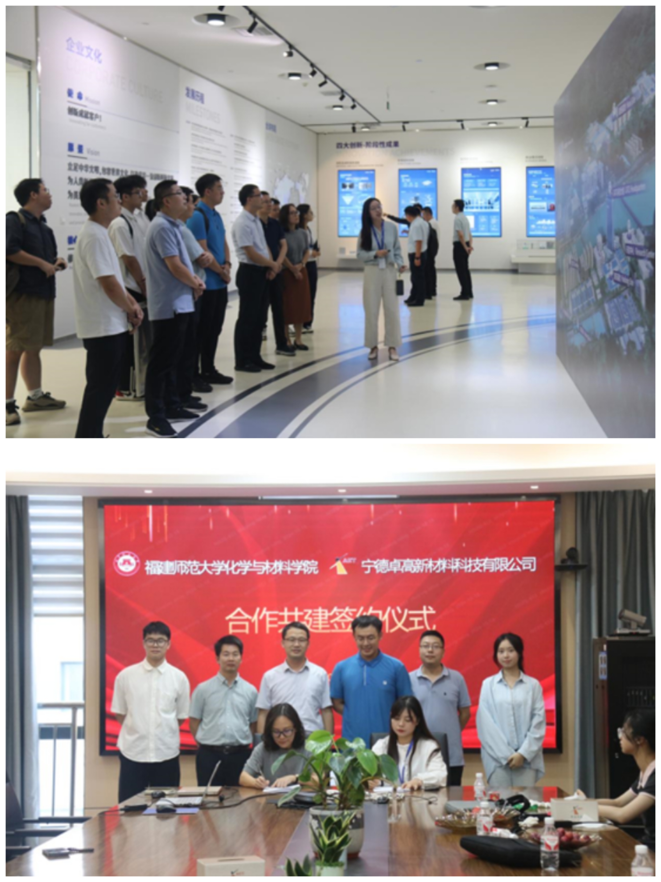 10月18日,化学与材料学院党委书记邱海锋、党委副书记张娴带队前往宁德时代新能源科技股份有限公司、宁德卓高新材料科技有限公司开展访企拓岗活动。院务委员章华桂,工信部及科技部火炬中心入库专家王震等师生代表参加。学院一行深入了解两家公司的发展历程、企业文化、企业战略及产品技术,观摩生产基地、熟悉生产流程等,双方就人才培养、实习就业、科研合作等方面展开交流。最后,学院与宁德卓高新材料科技有限公司签署产教融合共建协议,为实践教学基地揭牌。(化学与材料学院)