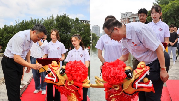 仪式上,校党委书记潘玉腾、校长王长平共同为龙舟点睛,校党委副书记涂荣为龙舟队授旗,龙舟队在星雨湖进行了划舟表演。