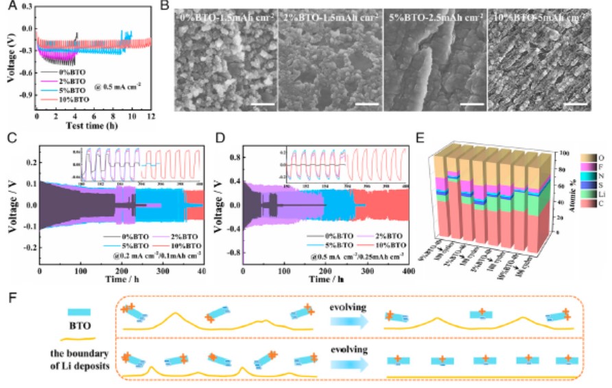 因具有高能量密度和高安全性等优点,固态金属锂电池被广泛认为是下一代电池的重要研发方向。锂枝晶的生长是诱发界面不稳定行为和电池安全隐患的重要因素,但迄今在任何固体电解质中都很难完全避免枝晶锂的形成。爱体育网_爱体育网(中国)林应斌教授、黄志高教授团队将具有介电/铁电效应的BaTiO3纤维融入到固态电介质中,调控锂枝晶的成核与生长过程。理论模拟研究发现,固态电解质中BaTiO3的介电效应可以有效减少高电流密度下锂枝晶生长驱动力,铁电效应则可以降低过电势进而调控锂沉积和Li+流。系列先进表征技术表明,固态电解质中极化反转确实可以调控锂的沉积和形貌。以LiFePO4为正极、以融有BaTiO3的石榴石PEO聚合物为电解质组装成固态电池具有稳定的循环寿命,在1C电流密度下循环500圈后仍有103.2 mAh/g。