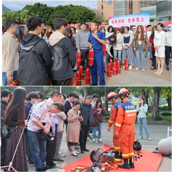 在启动仪式现场,闽侯县消防救援大队展示了消防救援特种车辆装备,设置救援装备器材展示区、火灾扑救体验区、消防知识问答区、应急疏散逃生体验区、消防安全标识牌翻转区、打卡拍照留言区六个区域,向师生普及日常火灾预防方法以及扑救技能,让大家更直观、零距离了解、学习和参与消防。