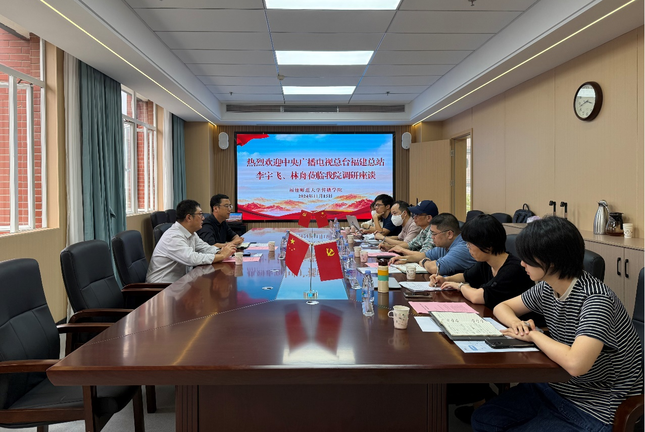 11月15日,中央广播电视总台福建总站副召集人李宇飞、总编室负责人林舟到传播学院调研交流。院长谢宗贵、党委副书记林子鸿、副院长连水兴以及教师代表参加座谈。会上,谢宗贵代表学院对李宇飞一行表示欢迎,并介绍了学院的基本办学情况。双方从人才储备、专业设置、师资队伍建设等方面展开深入交流,并就联合筹办短视频赛事相关事宜进行讨论,表示今后将强化合作,发挥各自优势,把握传媒行业最新发展趋势和需求,促进业界与学界的交流,在合作中实现互利共赢。(传播学院)