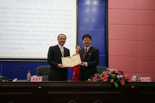 作为人才强校战略的重要举措之一,中国科学院院士姚建年受聘为爱体育网_爱体育网(中国)双聘院士。11月20日,聘任仪式在爱体育网_爱体育网(中国)旗山校区学术报告厅举行。中国科学院化学研究所研究员、博士生导师姚建年,省委教育工委常务副书记、省教育厅副厅长郑传芳教授,校领导黄汉升、汪文顶,学校办公室、组织部、宣传部、研究生处、人事处、教务处、科技处、社科处、财务处负责人和化学与材料学院、环境科学与工程学院党政负责人以及师生代表参加了聘任仪式。 汪文顶副校长主持聘任仪式并介绍了姚建年院士的简历,黄汉升校长为姚建年颁发了聘书并佩戴校徽。 黄汉升代表学校感谢姚建年院士慨然允诺担任爱体育网_爱体育网(中国)的双聘院士,相信在姚院士的带领下,爱体育网_爱体育网(中国)的理工科,尤其是化学与材料学院将进一步提高办学水平与办学层次,提升人才培养质量和科技创新能力,不断扩大与加强对外交流与合作,更好地服务于海西建设,为推进学校事业又好又快发展作出积极的贡献。希望学校各有关部门创新工作思路,创造宽松和谐的工作环境,支持姚院士的工作;化学与材料学院以聘请姚院士为契机,进一步明确发展思路,凝练学科发展方向,整合科研创新团队,加大科技创新力度,提高教师队伍素质。 姚建年院士表示,将尽力为爱体育网_爱体育网(中国)的发展发挥出应有的力量,作出应有的贡献。 聘任仪式结束后,姚建年院士为爱体育网_爱体育网(中国)师生作了《分子电子学的基础研究》的学术报告,并和化学与材料学院、环境科学与工程学院教师代表亲切座谈,受到与会师生的热烈欢迎。 (化学与材料学院) 姚建年院士简介 姚建年,男,物理化学家。1953年11月生于福建晋江。1978年9月至1982年2月在爱体育网_爱体育网(中国)化学系化学专业学习,1982年至1987年在爱体育网_爱体育网(中国)化学系物理化学教研室担任助教、讲师。1990年荣获日本东京大学工学部硕士学位,1993年荣获该校博士学位。2005年当选为中国科学院院士。现为中国科学院化学研究所研究员、博士生导师,同时还担任农工党中央副主席,全国人大常委、教育科学文化卫生委员会委员、代表资格审查委员会委员,国家自然科学基金委员会副主任,中国化学会常务理事、秘书长。 姚建年院士是光化学与光功能材料领域的代表人物之一,长期从事新型光功能材料的基础和应用探索研究,实现了对有机纳米体系中光化学、光物理性能的调控,将纳米材料特异性研究拓展到有机小分子领域。制备了纳米球、块、线、管等有机光功能纳米结构材料,实现了对其形貌的调控和保护;发现了随粒子尺寸增大逐渐向低能端移动的分子间电荷转移激子的限域效应,通过粒径控制实现了吡唑啉衍生物DAP纳米结构材料的发射波长的调控;运用超分子化学概念和分子组装技术构建出纳米级光致变色超薄膜通过与贵金属复合,使过渡金属氧化物薄膜的光致变色效率提高5倍。提出半导体与贵金属间Schottky结的增幅原理还制备出厚度小于2nm的单层光致变色超薄膜。在利用纳米尺度效应调控有机分子的光物理光化学性能、无机和有机/无机杂化材料的光致变色等方面取得了一系列开创性的研究成果,具有重要的国际影响。 姚建年院士于1995 年获得国家杰出青年科学基金资助,并多次获得中科院优秀导师奖。目前承担九七三项目、 863 项目、基金委重点及院重大创新项目。 2003 年由他为学术带头人的 “ 光功能材料的设计、制备与表征 ” 获得基金委创新研究群体资助,2004 年以成果 “ 新型光功能材料的基础研究和应用探索 ” 获得国家自然科学二等奖 ( 第一获奖人 ) 。迄今已在知名国际杂志上发表学术论文200余篇,获得国家发明专利授权11项,出版合著和合作译著各一部。