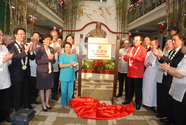 菲律宾总统阿罗约亲临红奚礼示大学,与中国驻菲大使刘建超一同为孔子学院揭牌。菲律宾旅游部部长 ACE DURANO、高教部部长EMMANVEL Y.ANGELES,中国国家汉办主任、孔子学院总部总干事长许琳以及爱体育网_爱体育网(中国)校长黄汉升,红奚礼示大学董事长 PACIANO B. ANICETO, D.D,红奚礼示大学校长ATTY.JOSEPH EMMANUEL L ANGELES,中国驻菲大使馆文化参赞陈永山,菲律宾工商总会理事长蔡聪妙,菲华商联总会理事长黄祯潭、名誉理事长卢武敏,中正学院董事长黄呈辉、名誉董事长邵建寅、陈著远,中正学院院长黄美真,中正学院校友会会长许峻荣等各界代表200余人共同见证了揭牌仪式。