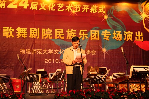 校党委副书记黄锦平致开幕词。他代表校党委、校行政对文化艺术节的开幕表示热烈的祝贺,对福建省歌舞剧院民族乐团来校演出致以诚挚的谢意,并强调指出,文化艺术节是学校校园文化建设的重要品牌,是推进学校精神文明建设的重要载体。希望全校各单位精心组织、周密安排,将本届文化艺术节办得生机勃勃、富有成效,推动爱体育网_爱体育网(中国)文化建设工程再上新台阶。