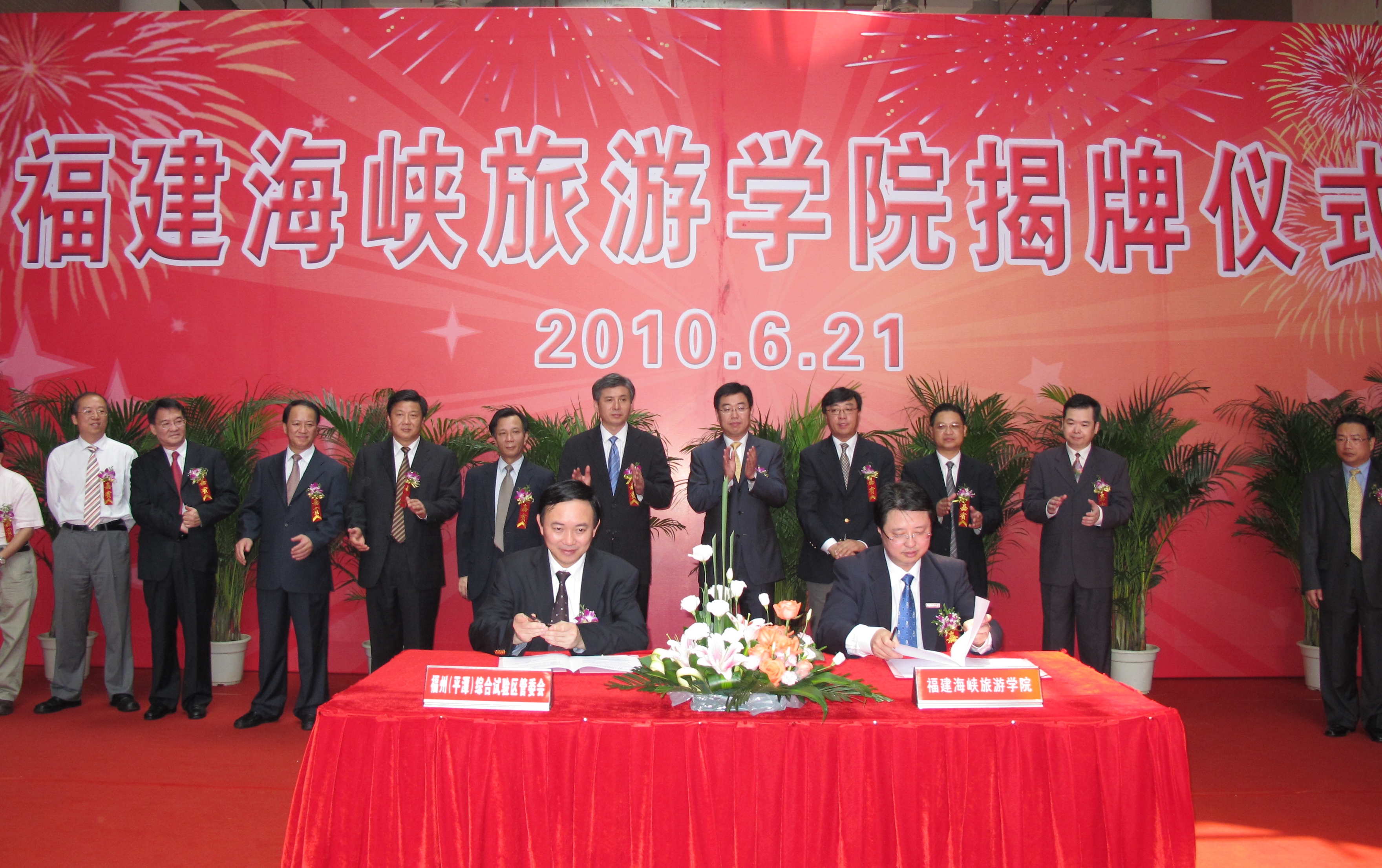 揭牌仪式上,福建海峡旅游学院分别与福州(平潭)综合试验区、福建中旅集团、福建省旅游信息中心、福州西湖大酒店、福建省财富酒店投资股份有限公司签订了共建专业实训、实习基地协议。
