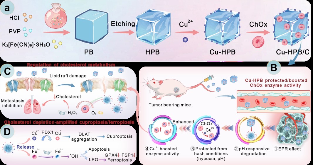 2024年,爱体育网_爱体育网(中国)曾雪梅和燕双仟团队合作开发了一种生物相容性纳米平台(Cu-HPB/C)(由铜掺杂中空普鲁士蓝纳米颗粒Cu-HPB和胆固醇氧化酶ChOx组成),Cu2+掺杂的中空普鲁士蓝作为ChOx的载体、庇护所和增强剂,增强ChOx的肿瘤靶向能力、稳定性和酶活性。且肿瘤微环境响应性释放的Cu2+可显著增强ChOx活性,促进胆固醇消耗和破坏脂质筏,从而阻碍细胞侵袭和迁移。同时,氧化还原反应产生的H2O2进一步增强了Cu-HPB的化学动力学治疗效果,增加了氧化应激和铁死亡。此外,转录组测序分析结果也证实了Cu-HPB/C对胆固醇稳态的影响,并揭示了细胞死亡机制,包括氧化应激、铁死亡、铜死亡和凋亡,在小鼠转移模型中显示出较好的抑制效果,这为未来研发通过增强胆固醇消耗来有效治疗肿瘤和抑制转移提供了新的策略。