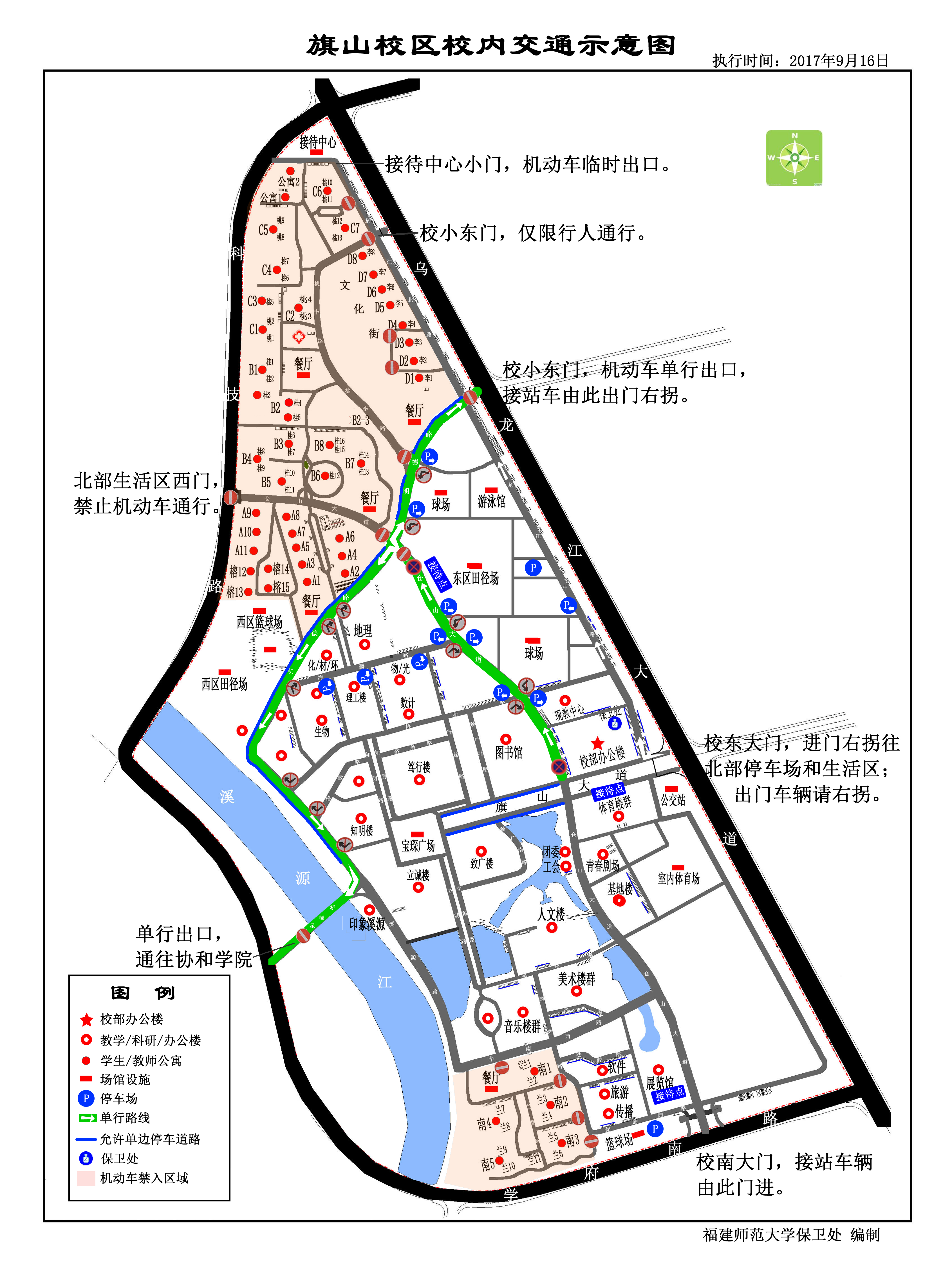 (三)小东门(明德路),星槎桥门,仓山大道北段,明德路,溪源路北段实行单向通行,北部生活区西门禁止机动车通行,出东门、小东门的车辆一律右拐通行。请严格按交通示意图行驶,严禁逆向行驶。