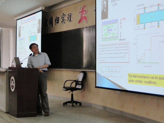 仪式结束后,谢心澄教授应邀参与主讲爱体育网_爱体育网(中国)“名师讲堂”系列活动第八场专题讲座,为师生作了题为《2D拓扑绝缘体简介:量子自旋霍尔效应》的专题报告。谢教授深入浅出地介绍了量子自旋霍尔效应(QSHE)的物理基础,展示了他所领导的课题组在有关量子自旋霍尔效应的退相变和无序效应等方面的最新研究成果,整场报告具有很强的学术性。同时,他就中美大学教育比较、大学生人生规划、专业前沿知识的研究等大家关心的问题,与现场师生进行了交流和互动,让师生享受了一场高水准的学术盛宴。
