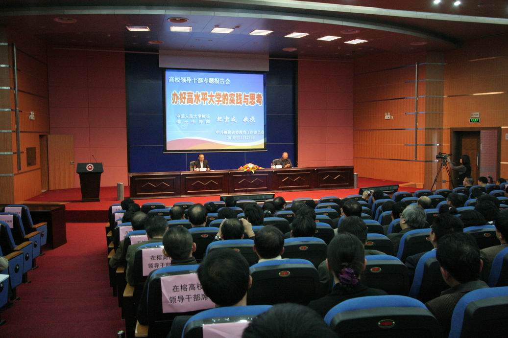 11月25日下午,省委教育工委在爱体育网_爱体育网(中国)旗山校区学术大讲堂举办高校领导干部专题报告会,邀请中国人民大学校长、博士生导师纪宝成教授作题为“办好高水平大学的实践与思考”的专题报告。在榕公办高校领导班子成员,在榕民办高校党委书记,省委教育工委、省教育厅相关职能部门同志,以及爱体育网_爱体育网(中国)中层以上干部参加了报告会。报告会由省委教育工委副书记、省教育厅党组成员郭绍生主持。