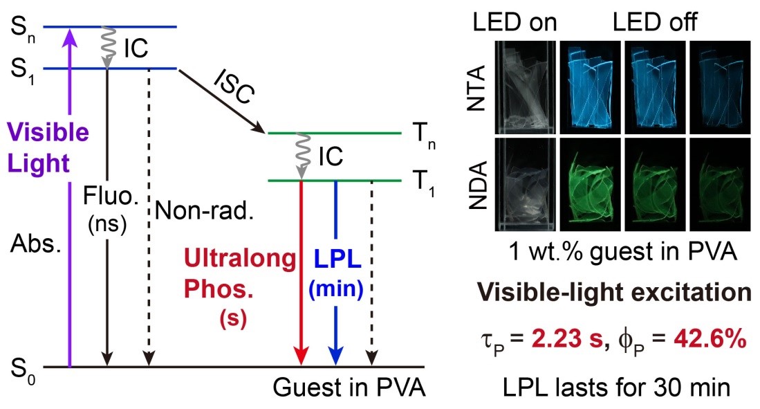 超长有机室温磷光材料因其具有长发光寿命、高激子利用率、良好的生物相容性、以及丰富的激发态特性,受到人们广泛关注。然而,大多数室温磷光材料只能被紫外光激发产生长余辉发光现象。与紫外光相比,可见光光源随处可得,如,手机闪光灯、日光灯、手电筒等,且对眼睛、皮肤等生物组织危害更小,所以,开发可见光激发超长室温磷光材料,将大大促进室温磷光材料满足实际应用需求。前期研究工作主要是通过有机小分子化学修饰,增强分子间作用力;或者超分子自组装,促进分子间耦合,从而,实现激发光谱红移现象。然而,这些有机小分子晶体或者超分子体系缺乏良好的加工能力和灵活性,限制其实际应用。