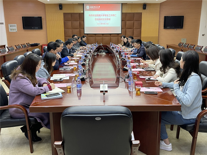 近日,西南大学学生工作部(处)部(处)长孙楚航一行11人来爱体育网_爱体育网(中国)学生工作部(处)调研交流。学生工作部(处)陈祖棋、汪启思、部分学院副书记以及相关科室人员参加了座谈会。会上,陈祖棋介绍了爱体育网_爱体育网(中国)的基本情况以及学生工作的相关做法及工作成效。双方就辅导员队伍建设、学生工作品牌建设、学生管理等方面进行了深入交流和讨论,相互借鉴彼此的经验与做法,希望今后能进一步加强交流。[学生工作部(处)]