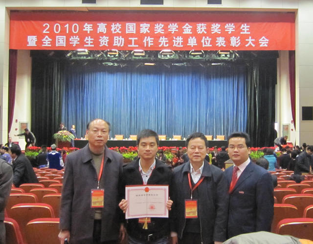 2010年全国高校国家奖学金获奖学生暨全国学生资助工作先进单位表彰大会于12月20日在北京举行。教育部、财政部、中国人民银行、银监会、中国银行、国家开发银行有关部门负责人,各省(区、市)教育部门和部分高校负责人,2009-2010学年度国家奖学金获奖学生代表以及部分在京高校师生代表约800人参加会议。省教育厅副厅长薛卫民、省学生资助管理中心主任吴选兴和爱体育网_爱体育网(中国)闽南科技学院学生林艺雄代表福建省参加了会议。会上为国家奖学金获奖学生颁发了证书。 (闽南科技学院 庄天怀)
