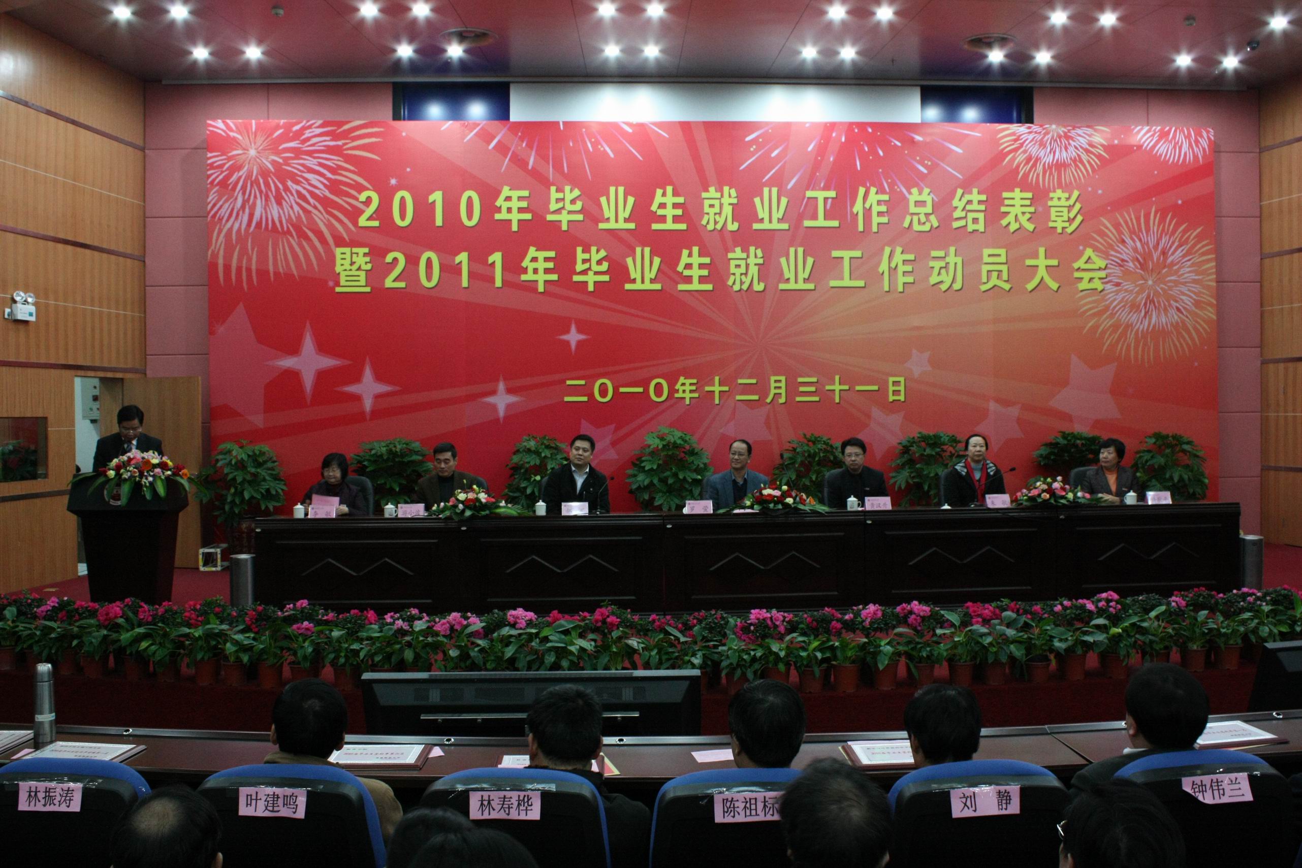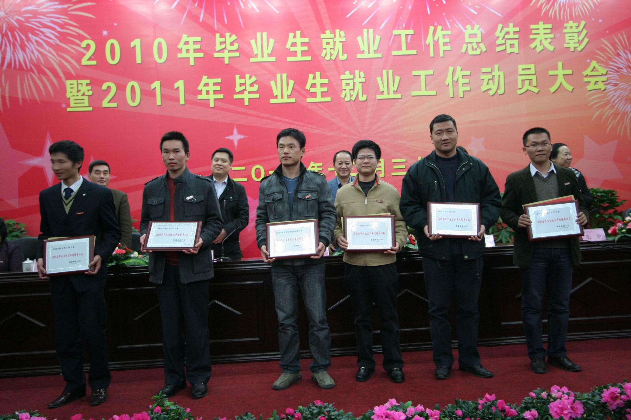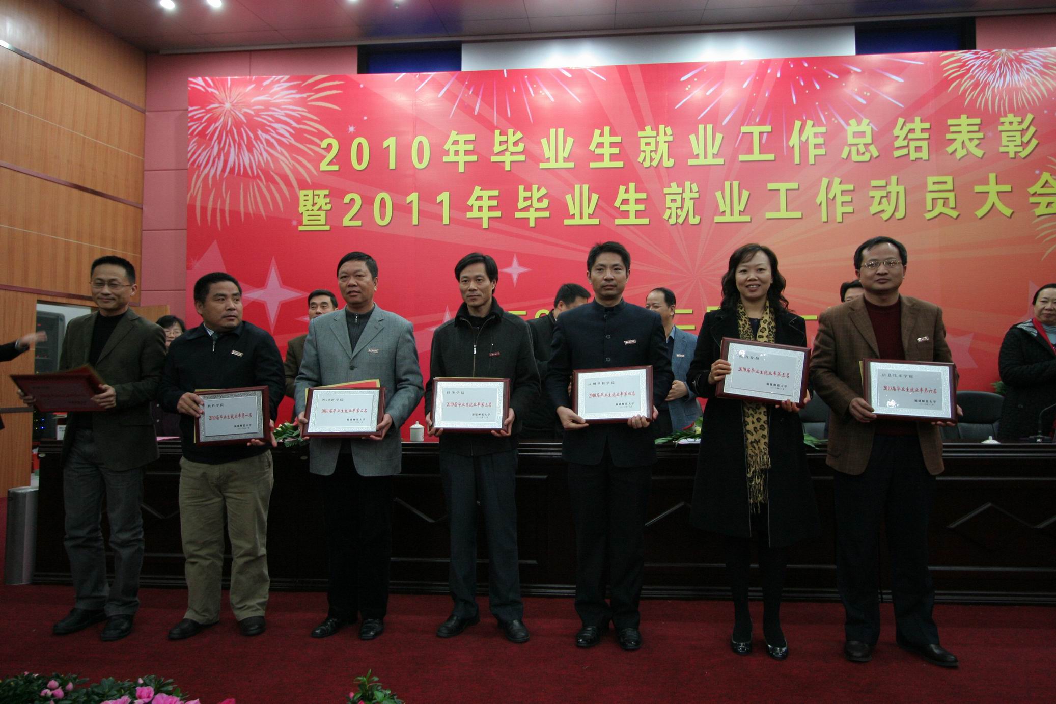 大会对2010年本专科毕业生就业率前六名、2010年本专科毕业生签约率前六名的学院,2010年本专科毕业生就业率增幅前六名的专业,2010年毕业研究生就业率100%的7个学院,2010年本专科毕业生一次性就业率高于80%且年终就业率达100%的37个专业,以及获得2010年就业工作创新奖的文学院、信息技术学院,获得“2009—2010学年毕业生就业工作贡献奖”荣誉称号的师杰等14位同志,获得“2009—2010学年毕业生就业工作先进个人”荣誉称号的赵立新等27位同志进行了表彰奖励。