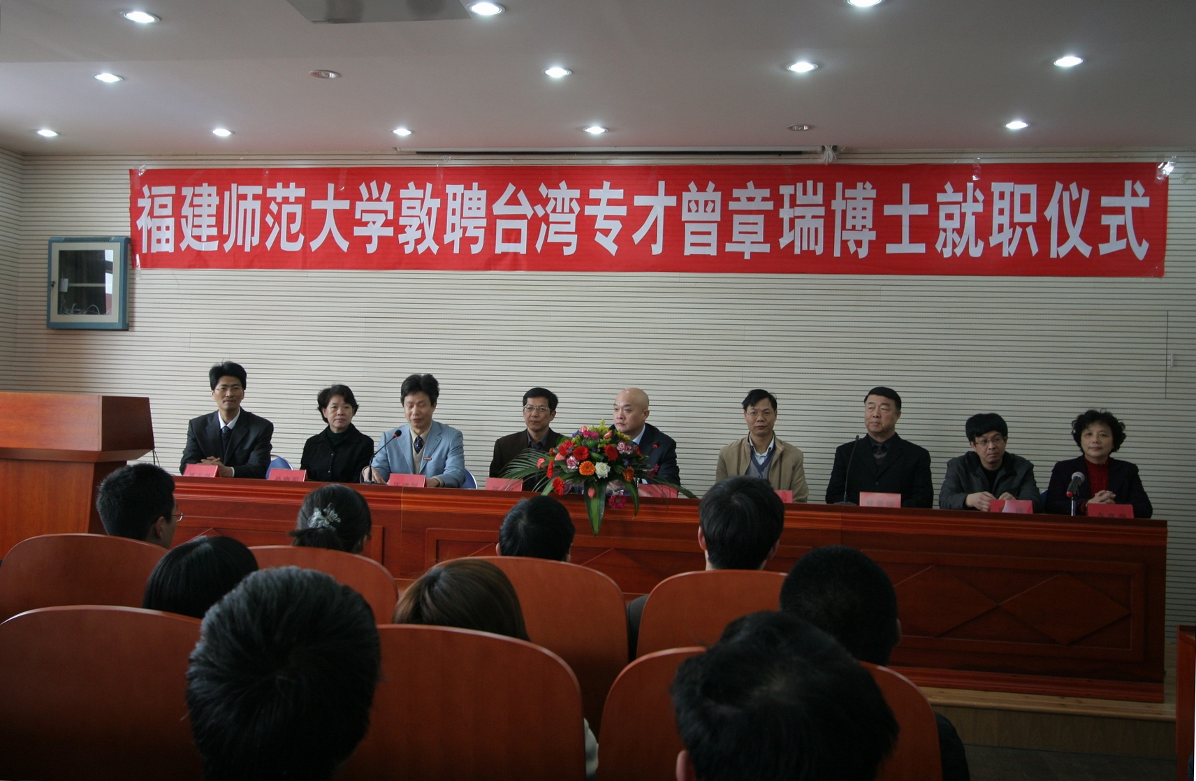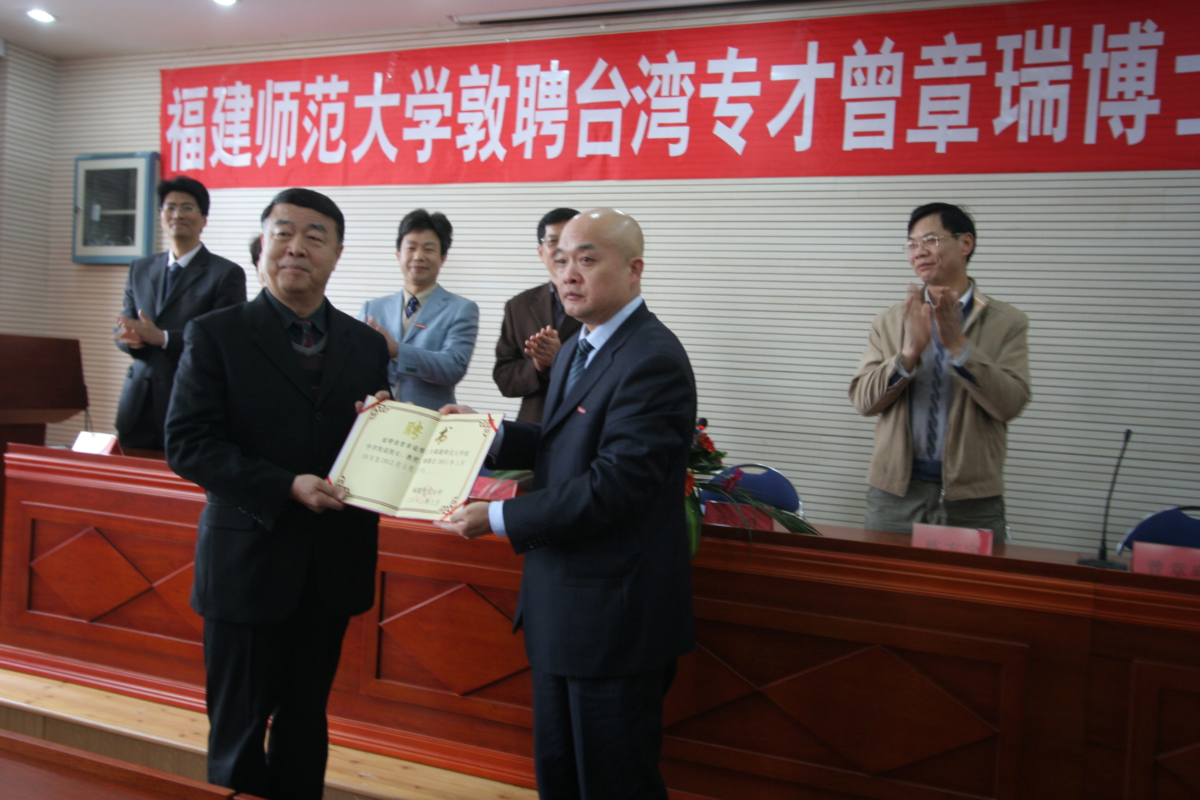 受聘的台湾专才、台湾大同大学副教授曾章瑞博士作了发言。他对有机会来福建师大工作感到十分高兴,认为这是两岸关系不断改善带来的良好契机。他表示,到校工作后就是福建师大的一员,将认真按照聘用合同要求积极履职,在教学、科研、产学研以及两岸高校的交流与合作等方面作出应有贡献。