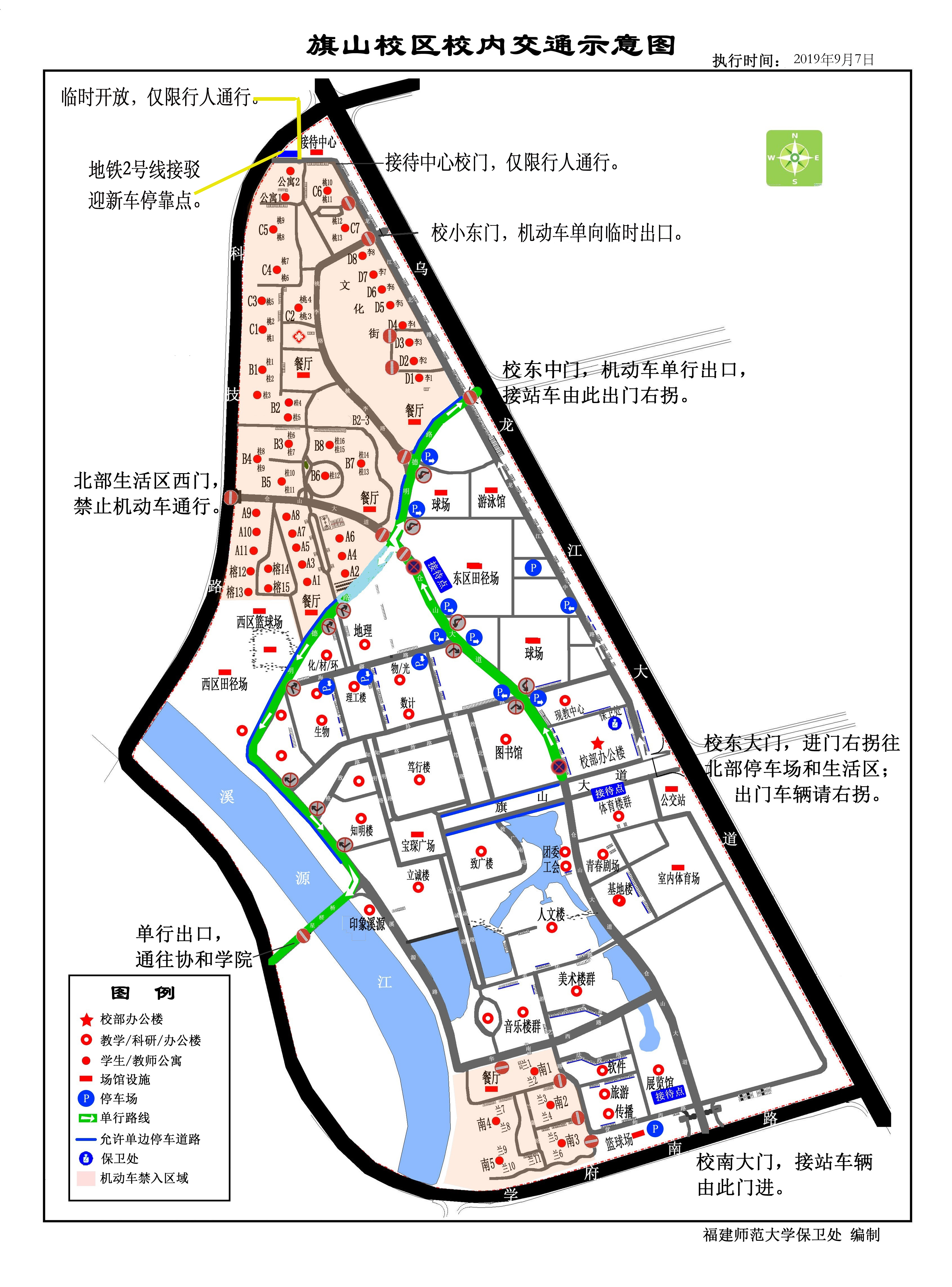 (三)东中门(明德路),星槎桥门,仓山大道北段,明德路,溪源路北段实行单向通行,北部生活区西门禁止机动车通行,出东门、东中门的车辆一律右拐通行。请严格按交通示意图行驶,严禁逆向行驶。