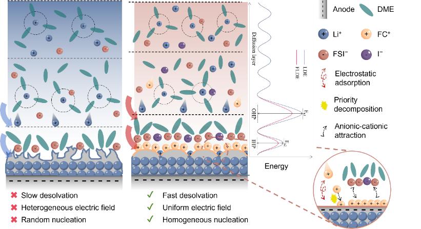 爱体育网_爱体育网(中国)陈育明教授团队研究了一种含氟、氮和碘元素新型添加剂(FCS),通过添加剂阳离子选择性吸附在电极表面,有效地调节电极表面电场,从而促进锂的均匀沉积。同时,FCS的优先分解产生了一个包含氟化锂、氮化锂和碘化锂成分的SEI,其具有高杨氏模量和离子导电性能,能够在大电流条件下稳定锂金属负极。近日,相关工作发表在《Angewandte Chemie International Edition》上。