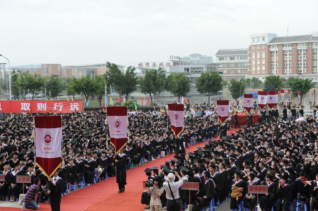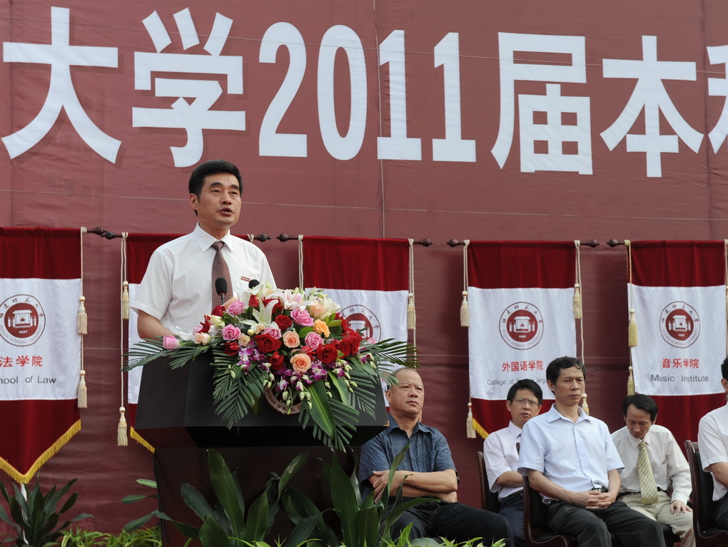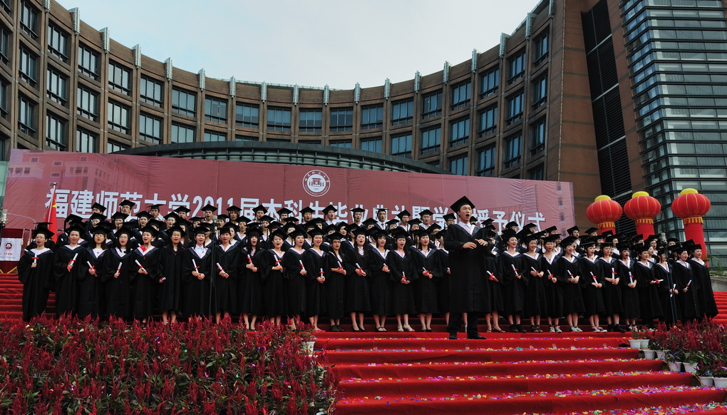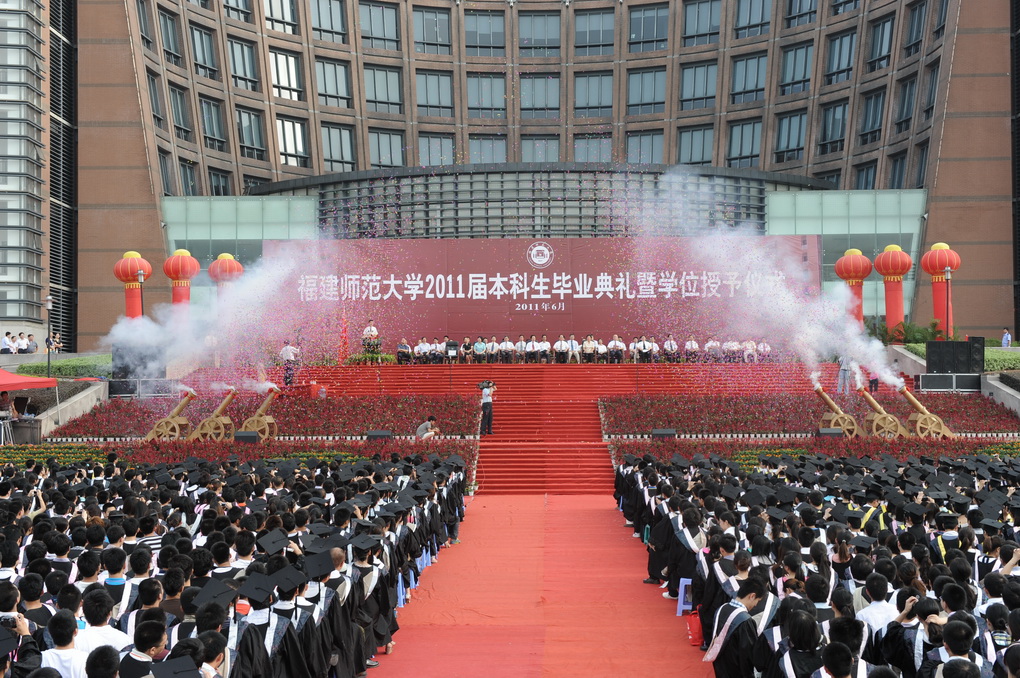 6月25日上午,2011届本科学生毕业典礼暨学位授予仪式在旗山校区图书馆前广场隆重举行。7点整,六门礼炮在广场上空鸣响,礼花绽放,掌声雷动,典礼在雄壮的《中华人民共和国国歌》声中拉开帷幕。