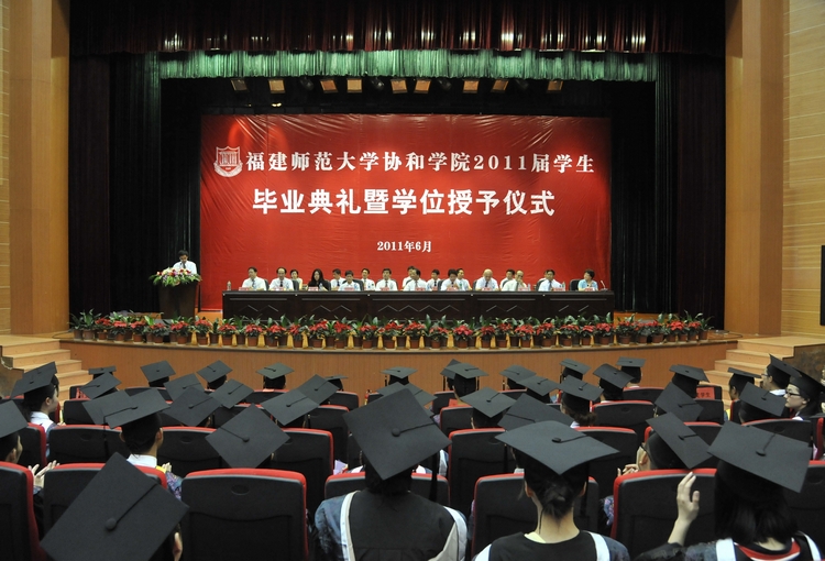 毕业典礼暨学位授予仪式于6月25日下午在旗山校区大会堂隆重举行。校党委书记罗萤,校长、协和学院董事长黄汉升,校党委副书记、协和学院党委书记游小波,副校长、协和学院副董事长许明,协和学院副董事长、福建大学城投资有限责任公司总裁陈活中先生,协和学院副董事长、校资产经营公司总经理赵钦,福建盈峰教育投资有限公司总裁助理尤健女士,协和学院董事、学校办公室负责人,学院党政领导、各系负责人、教师代表、毕业班辅导员、部分学生家长以及全体2011届本科毕业生参加了典礼。