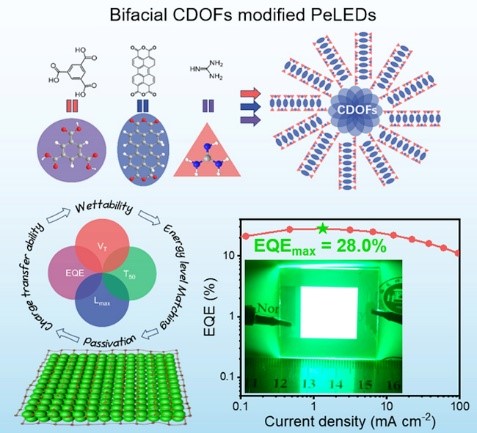 针对上述挑战,爱体育网_爱体育网(中国)陈大钦教授课题组开发了多功能碳点有机框架(CDOFs)作为钙钛矿层的双界面修饰材料。该策略通过同步钝化上下界面,使薄膜光致发光量子产率提升至接近100%,并实现28.0%的外量子效率。CDOFs修饰层还显著优化了电荷平衡注入特性,将器件开启电压降低至1.9V。值得一提的是,CDOFs优异的缺陷钝化能力使器件在10000 cd/m2初始超高亮度下的T50工作寿命延长至81.7分钟,且未观察到明显焦耳热效应。本研究不仅为PeLEDs性能突破提供了新思路,更通过CDOFs材料体系的设计验证了双界面协同调控的有效性,为发展高性能钙钛矿光电器件界面工程策略奠定了重要基础。