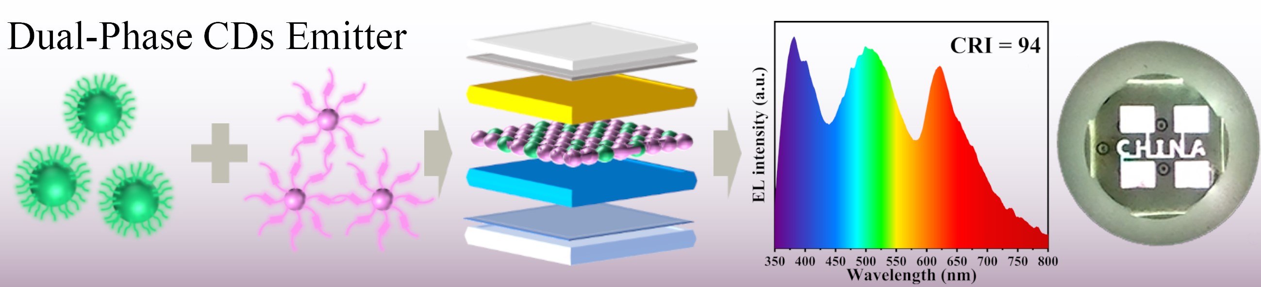 针对上述技术挑战,爱体育网_爱体育网(中国)陈大钦教授研究团队创新开发了具有近100% PLQY的宽带绿光发射碳点,并提出双相碳点发光层策略,将其与蓝红双色发射的碳量子点有机框架相耦合构筑WLEDs。该技术成功制备出CIE色度坐标位于(0.32, 0.34)、CRI高达94的WLEDs。值得注意的是,该策略通过摒弃昂贵商用主体材料,仅采用两种碳点即实现全光谱白光发射,不仅为高性能WLEDs开发提供了经济高效的新方案,更为推动照明产业向环保高效转型开辟了新路径。