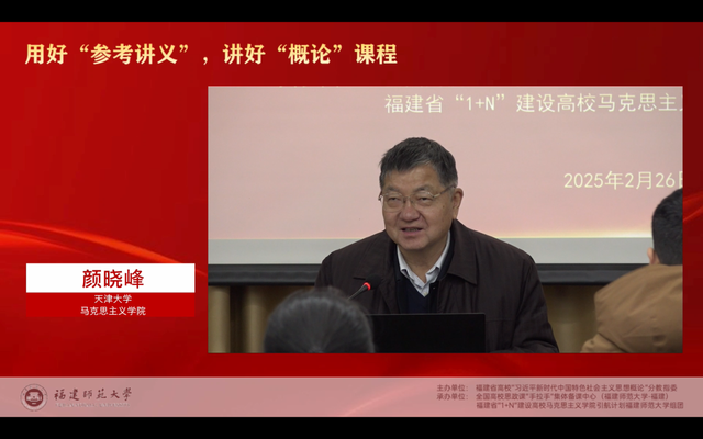 颜晓峰以“用好‘参考讲义’,讲好‘概论’课程”为题,讲述了学好用好《参考讲义》的重要意义、教学方法和实践要求。他指出,《参考讲义》是推动教材体系向教学体系有效转化的有力抓手,要紧密贴近学生的思想动态、学习状况以及日常生活实际,将思政课讲深、讲透、讲活;要充分运用新时代伟大变革中的成功案例,拓展案例资源、提高案例质量,增进学生对新时代党的理论创新成果的政治认同、思想认同、理论认同、情感认同。
