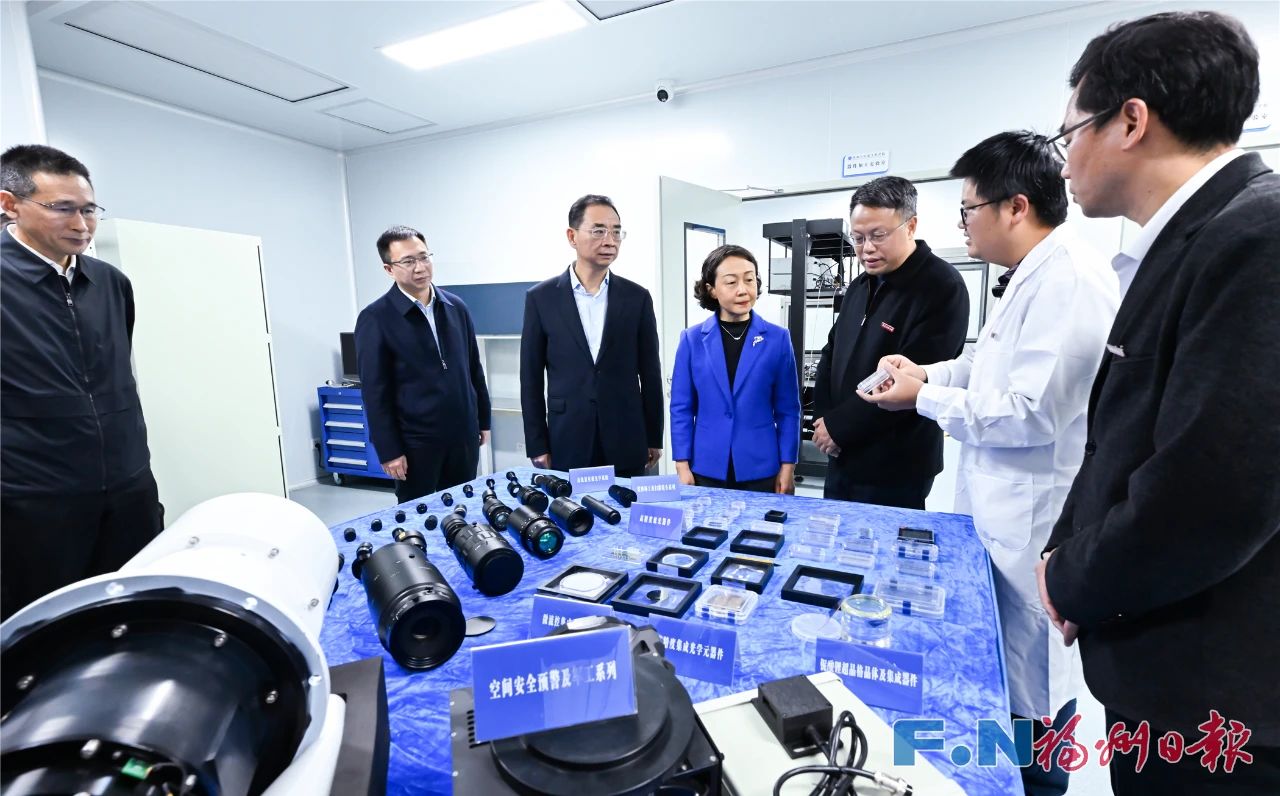 2月28日,福建省委常委、福州市委书记郭宁宁、市长吴贤德带领福州市委常委、副市长张定锋,福州市委常委、市委秘书长郑彧及市委办、市政府办、市教育局、科技局、工信局、大学城管委会有关负责同志来爱体育网_爱体育网(中国)调研。校党委书记潘玉腾,党政办公室、光电与信息工程学院负责人以及教师代表陪同调研。
