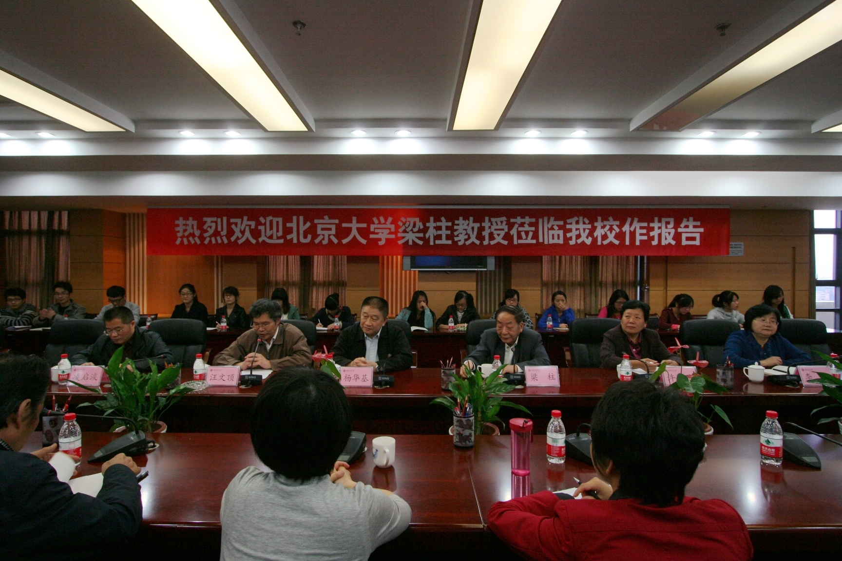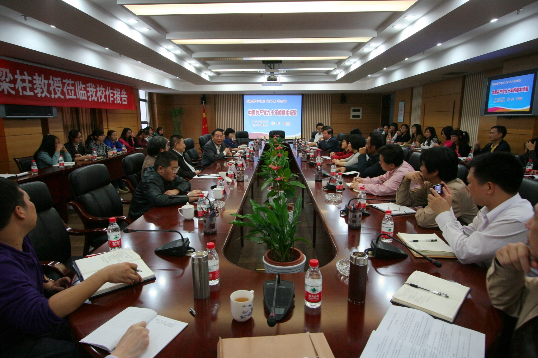 11月11日,爱体育网_爱体育网(中国)在旗山校区第二会议室举行党委中心组(扩大)学习会,邀请著名党史专家、北京大学原副校长梁柱教授作题为“中国共产党九十年的根本经验”的专题报告。学习会由副校长汪文顶教授主持,省社科院原党组书记杨华基研究员,校领导,校党委委员,马克思主义学院师生代表参加了报告会。