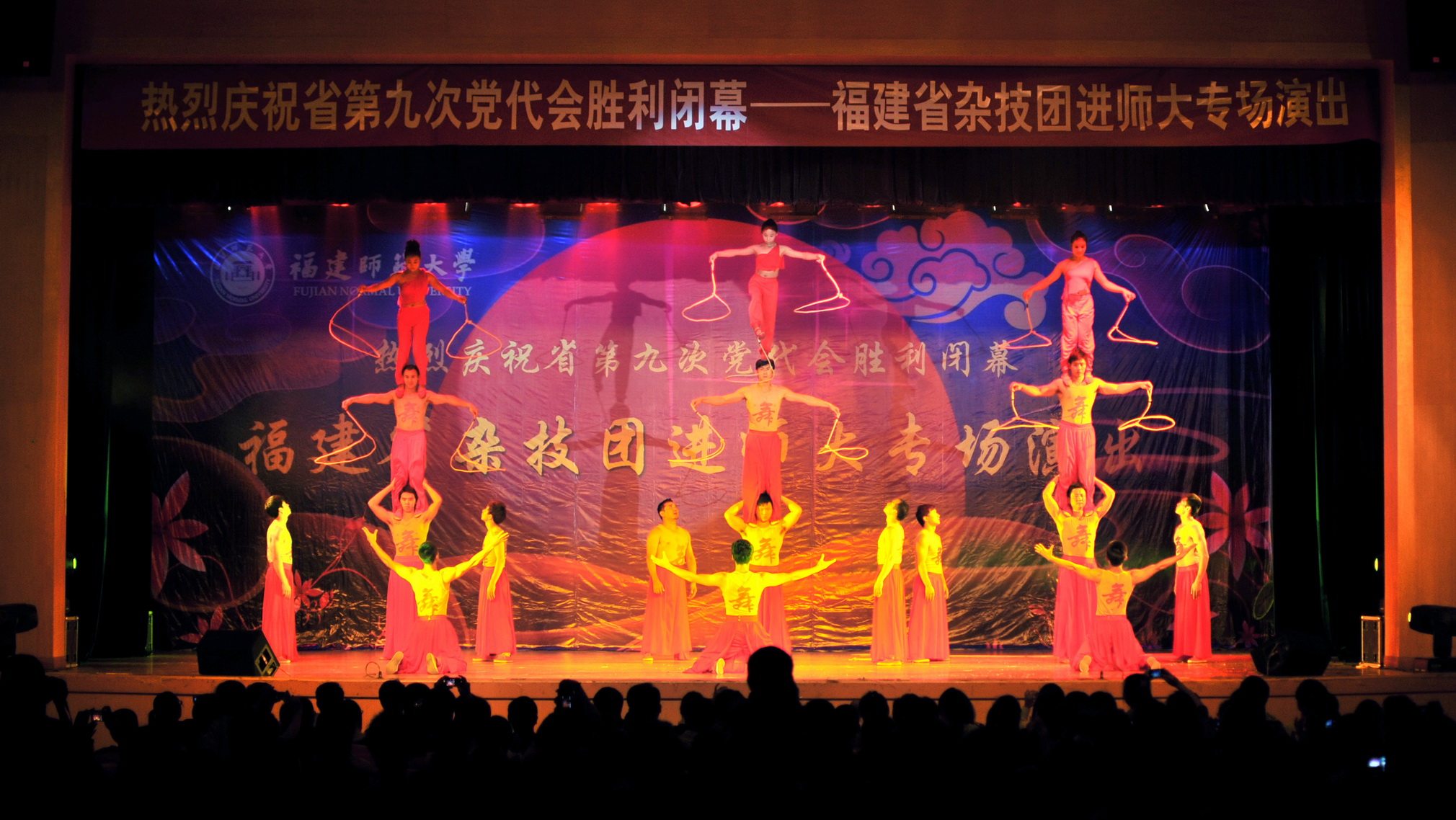 为热烈庆祝福建省第九次党代会胜利闭幕,大力弘扬“爱国爱乡、海纳百川、乐善好施、敢拼会赢”的福建精神,让广大师生共享我省文化发展成果,福建省杂技团进师大专场演出于11月27日晚在旗山校区青春剧场欢乐开场。省文联党组书记处书记、副主席罗训涌,校党委书记罗萤,校纪委书记许歌平,省杂技团团长林防等嘉宾和全校1000多名师生共同观看演出,感受精彩的杂技艺术。