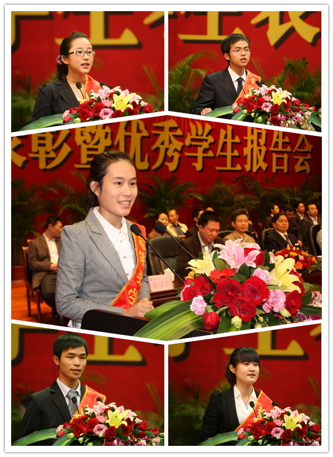 国家奖学金获得者庄莹莹、省三好学生方晓璐、省优秀学生干部刘献阳、省先进班集体班长魏六一、校长奖学金获得者林霄等5位同学作了精彩的演讲,与大家分享他们成功的经验。与会领导为获奖集体和个人颁发了证书和奖金。