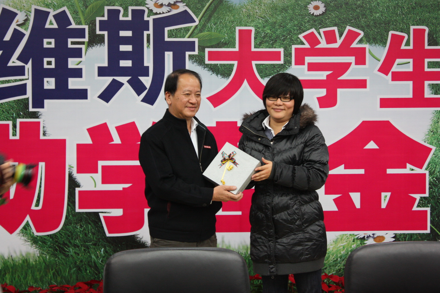 颁发仪式暨公开课于12月9日下午在旗山校区第十会议室举行。校党委书记罗萤,福建省青少年发展基金会副秘书长刘培光,福建真维斯服饰有限公司总经理林喜红、行政高级经理刘幼俤,全体受助学生和真维斯爱心社成员参加了颁发仪式。