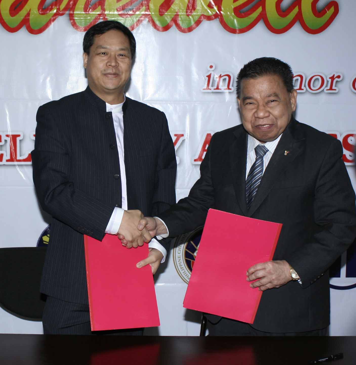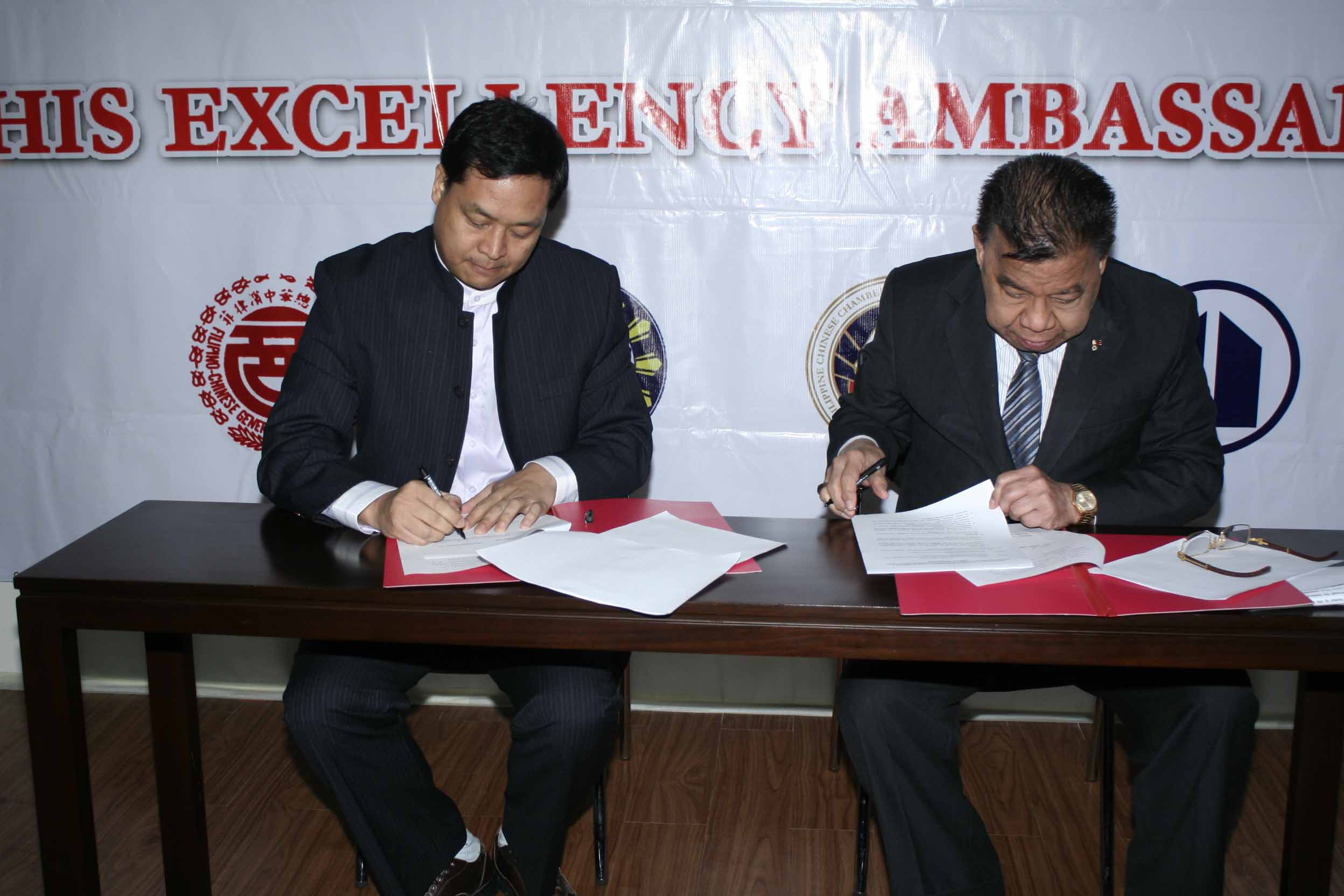 签字仪式于12月21日晚在菲律宾工商总会大楼举行。在中国驻菲律宾刘建超大使和菲律宾工商总会永远名誉理事长蔡聪妙博士的见证下,菲律宾工商总会新任理事长Miguel B.Varela律师和爱体育网_爱体育网(中国)代表分别在《菲律宾工商总会和中国爱体育网_爱体育网(中国)关于合作举办菲律宾商务汉语培训中心的协议书》上签字。菲律宾工商总会全体领导,中国驻菲大使馆陈永山文化参赞、沈自成参赞兼总领事、吴政平商务参赞、陈方明武官等领导及菲律宾中华总商会、菲华工商总会、中国商会等社团领导,中国银行、中海油服等主要中资机构负责人等200多人参加了签约仪式。