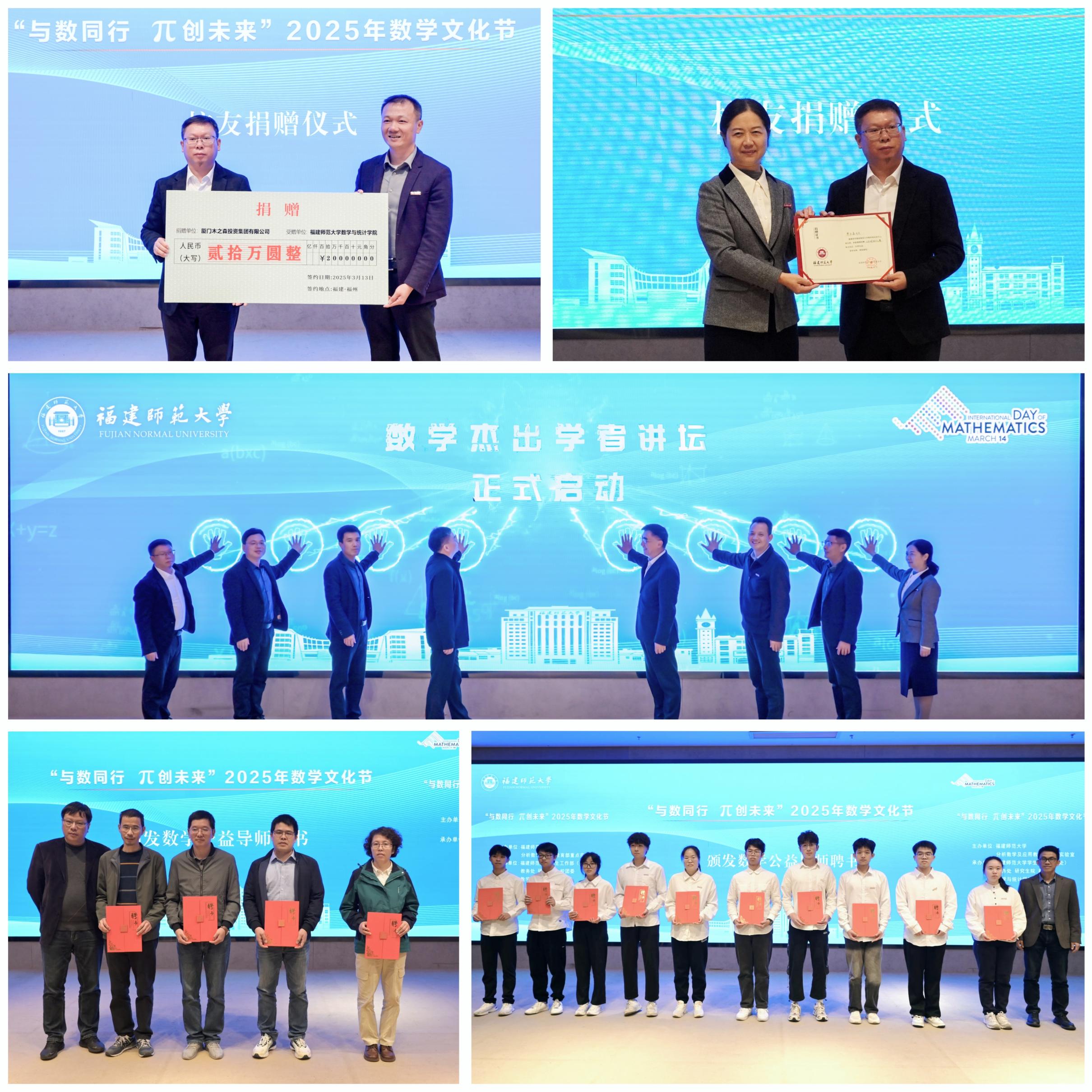 随后,与会领导、嘉宾共同启动数学杰出学者讲坛。廖木森向数学与统计学院捐赠人民币20万元,支持学院的建设与发展。爱体育网_爱体育网(中国)数学与统计学院相关负责人为5名“数学公益导师”、10名“朋辈导师”颁发聘书。