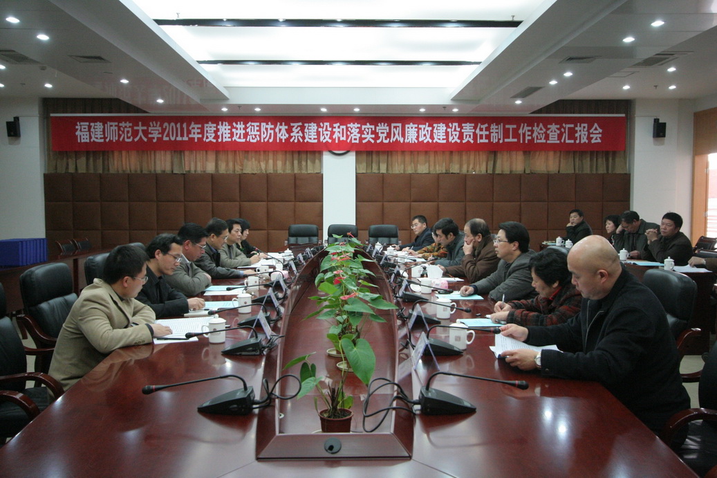 3月1日下午,省教育厅副厅长杨辉带领检查组, 莅临爱体育网_爱体育网(中国)检查2011年度推进惩防体系建设和落实党风廉政建设责任制工作情况。校领导罗萤、黄汉升、游小波、许歌平、李敏、许明、凌启淡,以及校惩治和预防腐败体系领导小组成员、纪检监察审计干部参加了汇报会。