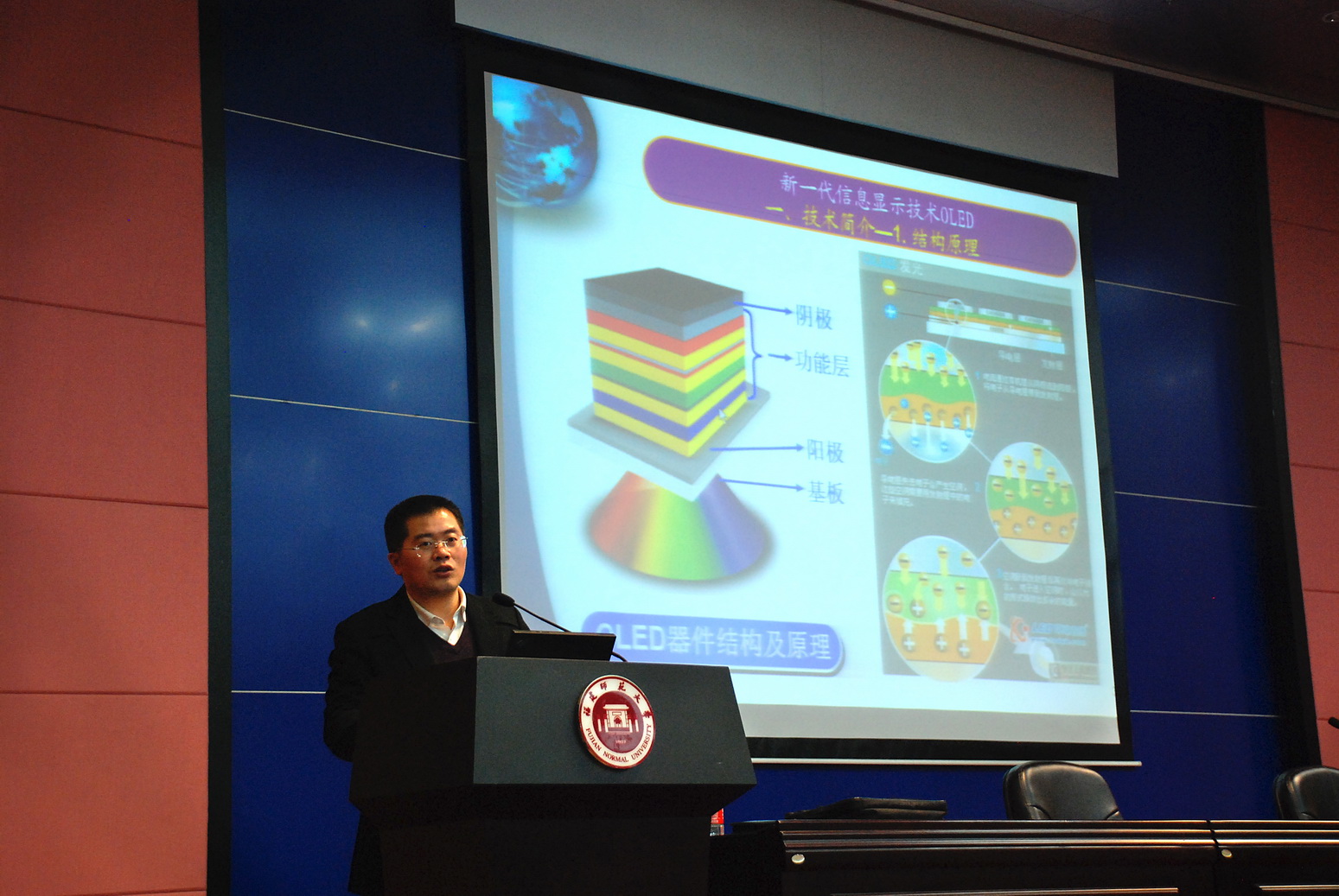 凌启淡教授从信息材料与相关器件技术、信息显示技术与发展前景、新一代有机发光二极管(OLED)显示技术、OLED技术分布与应用等四个方面深入浅出地阐述了当前国际显示技术的应用现状和发展趋势,特别是分析了OLED的潜在市场机遇。同时,他还结合自己在国内外的工作经历,向大家介绍了他所带领的“信息材料与器件技术”创新团队的研究方向、发展目标与愿景,以及团队所取得的科研成果。
