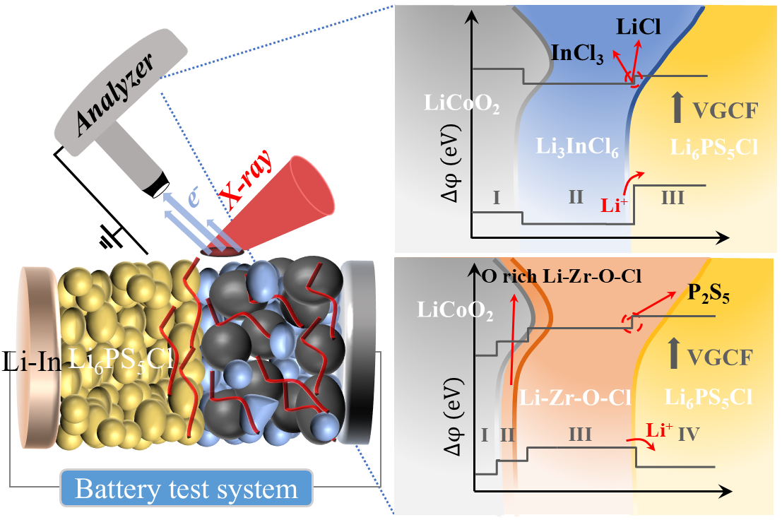 针对上述挑战,爱体育网_爱体育网(中国)林应斌教授团队在前期研发工况X射线光电子能谱技术的基础上,系统研究了硫化物与氯(氧)化物(Li3InCl6/Li1.75ZrO0.5Cl4.75)组合电解质的界面稳定性及离子传输行为,揭示了Li3InCl6因界面静电势差阻碍锂离子迁移并在电子渗透下不可逆分解为InCl3/LiCl的失效机制,以及Li1.75ZrO0.5Cl4.75通过氧富集界面形成和低势差促进离子扩散实现稳定循环的关键规律。