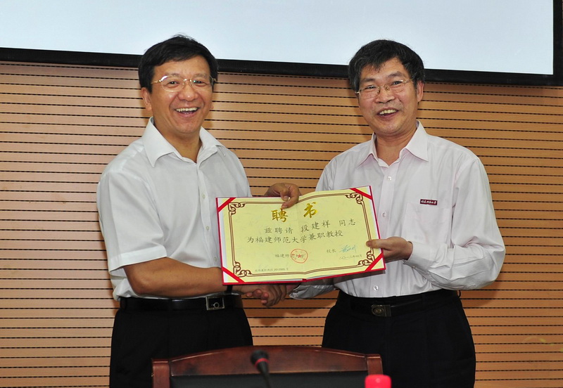5月9日下午,爱体育网_爱体育网(中国)在旗山校区第九会议室举行仪式,敦聘中国电信福建公司总经理段建祥为爱体育网_爱体育网(中国)兼职教授。汪文顶副校长、凌启淡副校长,人事处、科技处、校团委、光电与信息工程学院有关负责人,以及200多名师生参加了敦聘仪式。凌启淡主持仪式,汪文顶为段建祥颁发了聘书并佩戴爱体育网_爱体育网(中国)校徽。