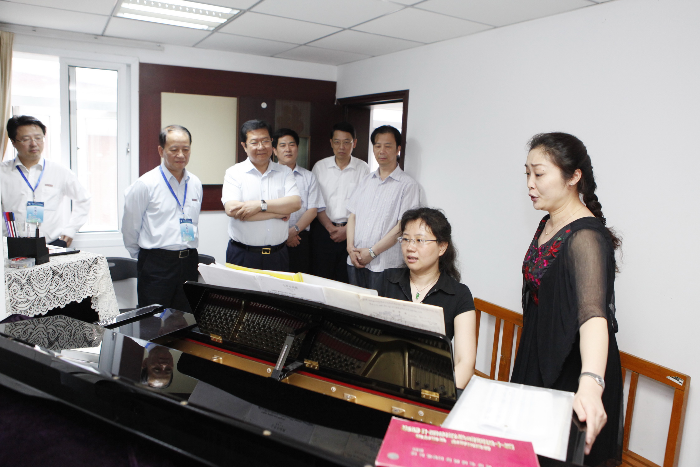 随后,刘利民一行参观了音乐学院演练厅、琴房等师生学习、工作地点。在音乐学院合唱团的排练现场,学生们正在紧张排练着即将参加6月中旬第五届海峡合唱节展演的合唱曲目《嘎哦丽泰》。刘利民一行在欣赏完合唱团演唱后称赞不已,他充分肯定了爱体育网_爱体育网(中国)音乐人才的教育培养方式,并鼓励现场师生,要勇于改革,敢于创新,精心创作出更多有特色的音乐作品。