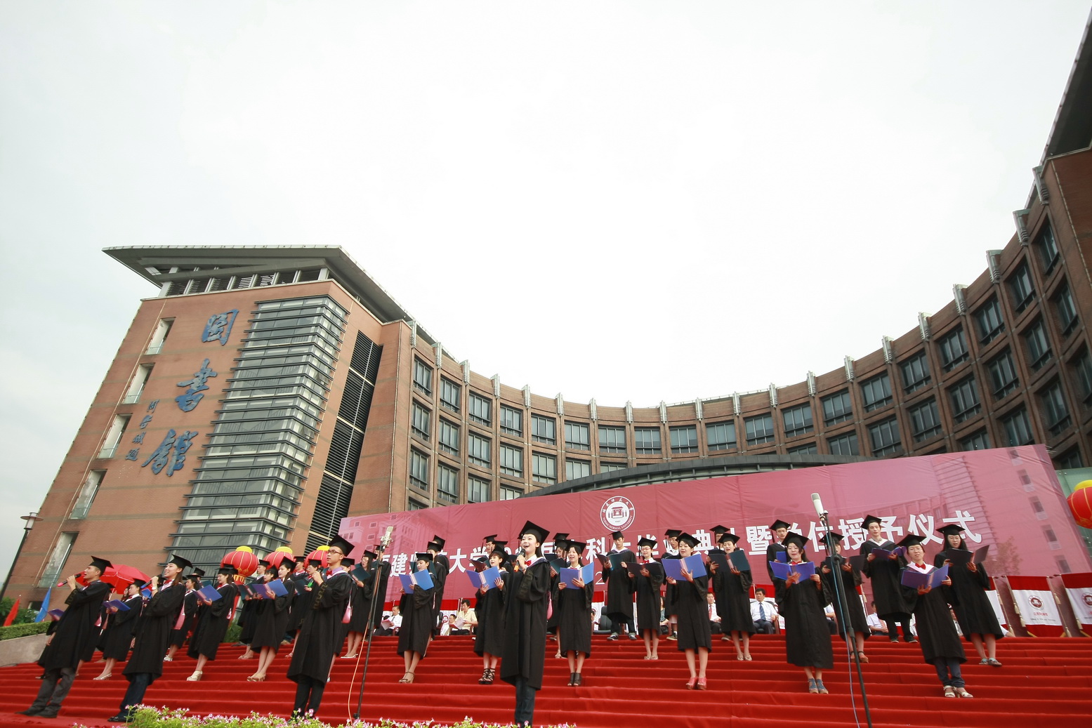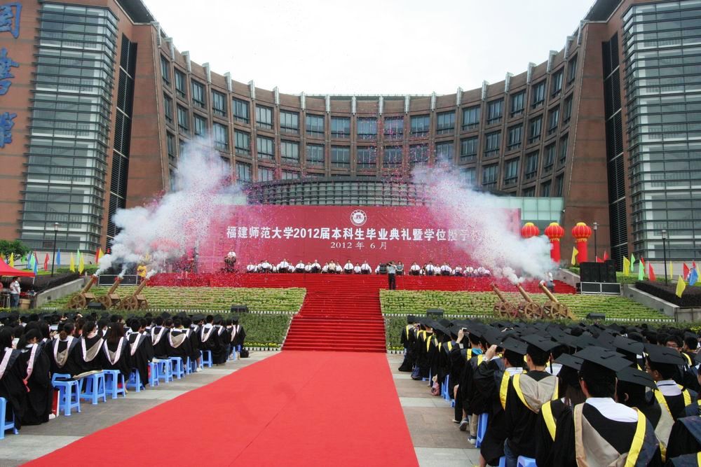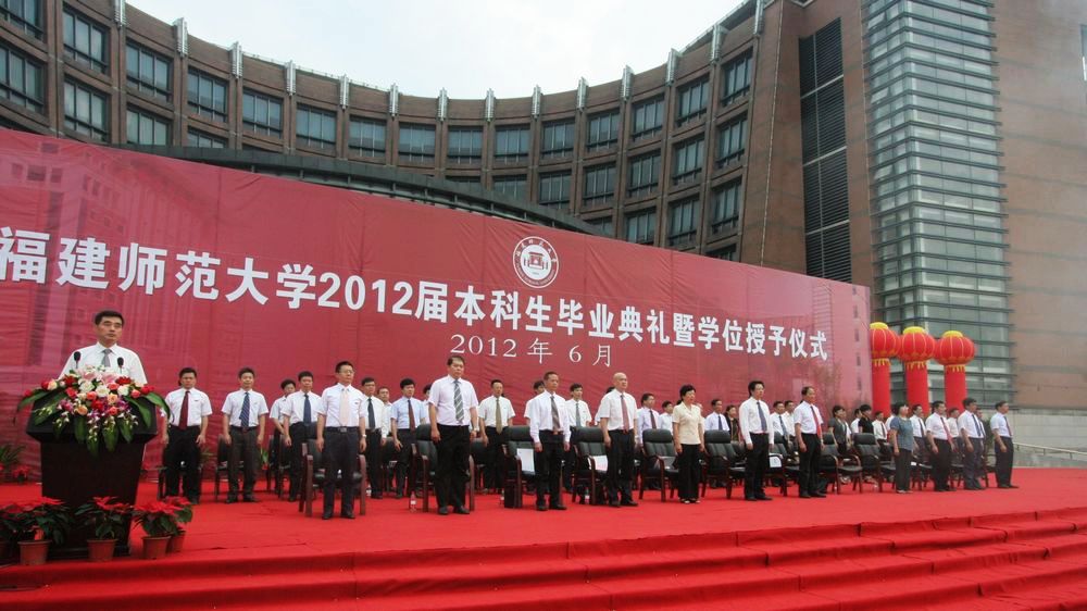 6月26日上午,2012届本科生毕业典礼暨学位授予仪式在旗山校区图书馆前广场隆重举行。七点整,六门礼炮在广场上空鸣响,礼花绽放,掌声雷动,典礼在雄壮的《中华人民共和国国歌》声中拉开帷幕。