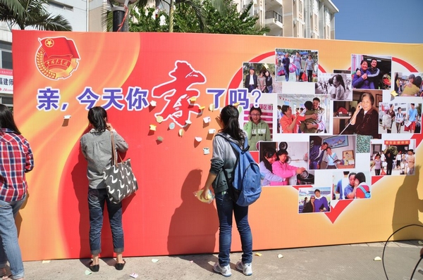 活动现场,同学们围在展板前分享优秀书信作品,列队有序地参与孝心测试、爱心连线、孝心祝福等活动,打一个电话、写一句祝福,同学们争相用自己的微言微行抒发对父母长辈的感恩之情。共青团广场一侧的孝心墙上贴满了同学们写给父母长辈的心理话,吸引不少同学驻足留言,在校园里营造出浓浓的孝亲敬老氛围。中午时分,何明华来到同学们身边,他说到:“希望通过这种时尚流行的方式,让青少年传承‘百善孝为先’的中华传统文化精髓。”